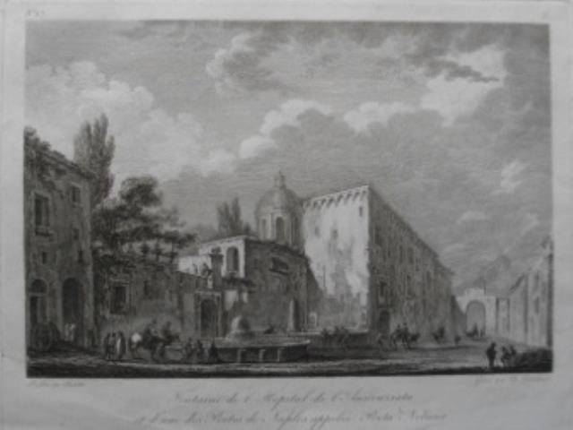 Veduta dell’Ospedale dell’Annunziata e di una delle porte di Napoli chiamata Porta Nolana. Rifilati i margini in prossimità della battuta, l’ inferiore, di fine esecuzione e buono l’inciso. .