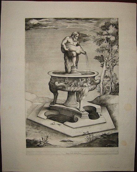 Incisione originale su rame (cm. 24x35,4 più ampi margini bianchi). Carta vergellata con filigrana. Esemplare in ottimo stato di conservazione. Firma nella parte inferiore dello specchio di stampa: ‘P. Perret f. 1581’. Imprint in basso al centro: ‘Romae. Claudii ducheti. formis’. La curiosa fontana qui raffigurata ha come basamento il celeberrimo vaso Torlonia neo-attico. Un’antica statua di Sileno, seguace del dio Bacco, fu aggiunta al vaso dopo il 1550. L’incisione documenta quindi una curiosa opera d’arte ibrida che combinava il gusto classico a quello rinascimentale. Stampa assai rara non menzionata nella raccolta Arrigoni-Bertarelli né in Rubach. Antoine Lafrery (Antonio Lafreri nella forma italianizzata), incisore, editore e mercante di stampe curò la pubblicazione tra il 1544 ed il 1575 di una serie di circa 200 incisioni - raffiguranti perlopiù monumenti ed antichità romane ed opera di diversi autori - nota come ‘Speculum Romanae Magnificentiae’. Le stampe erano poste in vendita sia singolarmente che sotto forma di raccolta con un numero spesso variabile di fogli. Dal 1574 iniziò a circolare anche una tavola-frontespizio dello ‘Speculum’, attribuita a Etienne Duperac. Successivamente, tra il tardo Cinquecento ed il Settecento, i rami lafreriani conobbero tirature posteriori con l’imprint di vari editori ed il contributo di diversi incisori. Inoltre lo ‘Speculum’ fu ampliato nel tempo mediante l’aggiunta di altre tavole il cui minimo comune denominatore appare quello di riprodurre opere antiche e moderne di Roma.