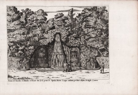 Veduta della Fontana del Belvedere nella Villa Aldobrandina di Frascati. Acquaforte, 1618, tratta dalle Fontane diverse che si vedano nel' Alma Città di Roma et altre parte d'Italia. Delineate da Giovanni Maggi Romano pittore et architetto, con diverse altre novamente dal istesso inventate et poste in luce ad instanza di Giosepe de Rossi milanese/ In Roma con licentia dell' Superiori / L'Anno M.D.C.XVIII'. La serie comprende trentatré incisioni di Giovanni de Maggi e una di Francesco Corduba. Sono descritte in modo esauriente da Peter Fuhring nel suo catalogo delle stampe d'ornamento del Rijksmuseum (nn. 8280-8337). La composizione della serie, stampata da Giuseppe de Rossi, varia da una raccolta all'altra, e inoltre sono note copie di alcune delle tavole. La prima edizione fu pubblicata da Giuseppe de' Rossi nel 1618, con edizioni successive nel 1645, 1651 e una non datata tutte a cura di Giovan Battista de’ Rossi. Bibliografia Berlin 1939 / Katalog der Ornamentstichsammlung der Staatlichen Kunstbibliothek Berlin (3597); Fuhring 2004 / Ornament Prints in the Rijksmuseum - the Seventeenth Century (8280). A view of the Fontana del Belvedere in the Villa Aldobrandina of Frascati. Etching, 1618, lettere with title at the bottom. Plate taken from the Fontane diverse che si vedano nel' Alma Città di Roma et altre parte d'Italia. Delineate da Giovanni Maggi Romano pittore et architetto, con diverse altre novamente dal istesso inventate et poste in luce ad instanza di Giosepe de Rossi milanese/ In Roma con licentia dell' Superiori / L'Anno M.D.C.XVIII'. The series comprises thirty-three etchings by Giovanni de Maggi and one by Francesco Corduba. They are most fully described by Peter Fuhring in his catalogue of ornament prints from the Rijksmuseum, nos.8280-8337. The composition of the series varies from surviving set to set, and in addition copies are known of some of the plates.The first edition was issued by Giuseppe de' Rossi in 1618, with later editions in 1645, 1651 and one undated. Bibliografia Berlin 1939 / Katalog der Ornamentstichsammlung der Staatlichen Kunstbibliothek Berlin (3597); Fuhring 2004 / Ornament Prints in the Rijksmuseum - the Seventeenth Century (8280) Cfr.