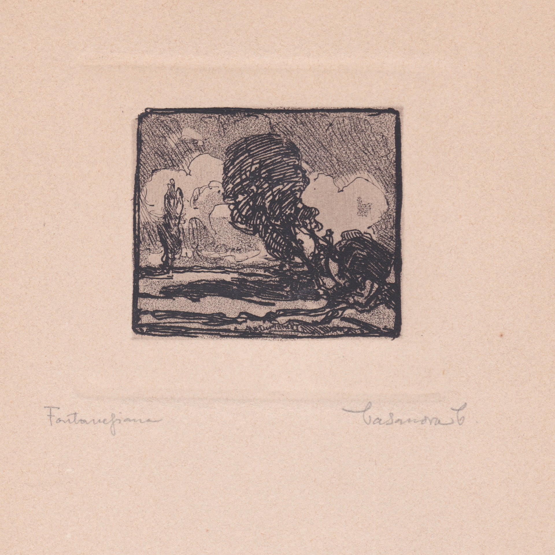 Il richiamo ad Antonio Fontanesi (Reggio Emilia 1818 – Torino 1882) non è solo nel titolo ma anche nell'impianto iconografico e nella tecnica. Nel piccolo foglio l'artista raffigura un paesaggio campestre, l'abilità è nei giochi di chiaroscuro creati con un segno profondo e deciso e l'impiego di diverse morsure. Nubi luminose si mescolano alle fronde scure mosse dal vento. La forza della natura domina il dinamismo della scena. L'acquaforte è stesa quasi si trattasse di un disegno e il sottile velo di acquatinta pare la materia delle terre sciolte dell'acquerello. In basso oltre l'inciso a matita titolo e firma: Fontanesiana, Casanova.