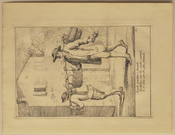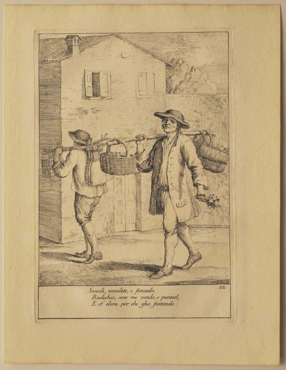 Acquaforte e bulino di mm 261 x 182. II/VI. Vergata veneziana tre lune, filigrana tre lune e scritta imperial.Bel foglio a pieni margini. Perfetta condizione. "Scovoli, scovolete, e forcaele, Radichio, scoe mi vendo, e puriziol, E st'elera per chi gha fontanele.". A destra in basso numero 22. Proveniente da "Le Arti che vanno per via nella Città di Venezia inventate ed incise da Gaetano Zompini. Aggiuntavi una memoria di detto autore" Venezia 1785. Magnifica incisione in acquaforte e bulino della serie delle "Arti che van per via" di Zompini, stampata in una rarissima prima edizione coeva nel 1753, ed in questo secondo stato nel 1785 dal residente britannico John Strange. Venne ripubblicato in Inghilterra altre quattro volte.Da una lettera di John Strange si viene a sapere che la tiratura della presente edizione era di cento o duecento copie.Dario Succi "Da Carlevarijs a Tiepolo, Incisori veneti e friulani del settecento" pag. 454. Dalla "Memoria" di Gianmaria Sasso, premessa a questa edizione: "Gaetano Zompini nacque in Narvesa, nel Territorio Trivigiano, il 29 settembre 1698; ed inclinando da fanciullo alla Pittura, fu mandato a Venezia nella Scuola del Cavalier Bambini in que' tempi riputatissimo. Apprese dal suddetto oltre li principi del buon dissegno, anche in gran parte il suo modo di dipingere, ed uscito poi di detta Scuola si diede anche ad imitare la maniera di Sebastiano Ricci, allora dal medesimo introdotta ed assai stimata.Inventò pure e disegnò per il sig. Zatta, stampatore in Venezia buona parte delle Figure per le Edizioni del Dante e del Petrarca da lui stampata. Questo degno Pittore visse però quasi sempre povero, avendo numerosa Famiglia. Conoscendo per altro il di lui merito il fu Sig. Antonio Maria Zanetti, lo tirò appresso di sé, impiegandolo in vari lavori, ed in particolare in vari disegni, e lavorò in gran parte sopra alcuni rami tratti da' disegni di Gio. Benedetto Castiglione, posseduti dal detto Signore, e che avea già incominciato ad incidere; e per far la raccolta più numerosa, inventò, disegnò, ed incise egli stesso alcuni di detti Rami sul gusto affatto dell'Autore, e toccati con spirito.Non avendo poi esso Sig. Zanetti di che ordinargli di più, s'immaginarono di dare alle stampe una Raccolta delle Arti di Venezia, che vanno per via. Si accinse dunque lo Zompini al lavoro, ed inventò, disegnò, ed incise Rami num.60 rappresentanti l'Arti suddette, e sotto la direzione dello stesso sig. Zanetti, ed a imitazione poi delle Arti di Bologna similmente inventate ed incise dal celebre Annibale Carracci. A quest'opera fatta all'acqua forte, della quale alcune copie furono anche miniate, aggiunse sotto ogni rame alcuni versi il Dottor Questini Prete di Santa Maria Mater Domini, amico tanto dello Zompini, che del Zanetti. Pochi anni dopo mancò di vita il sig. Zanetti, il quale però per ilmerito dello Zompini, gli lasciò una picciola mensuale provigione sua vita durante. Dopo questa disgrazia ne successe allo Zompini un'altra peggiore, incominciandosi ad indebolire la vista; cosicchè alla fine la perdette affatto, e strascinandosi in tal modo fra le miserie e la vecchiaia, mancò di vivere il 20 Maggio 1778 nell'avanzata età di 76 anni"Dal Succi (Da Carlevarijs ai Tiepolo): ".La prima edizione uscì in due tempi: nel 1753 fu pubblicata una parte comprendente quaranta stampe precedute da un frontespizio calcografico. Nello stesso anno, o più probabilmente, in quello successivo, vennero pubblicate le altre venti tavole.Le due parti vennero in seguito riunite in un unico volume in cui, dopo il frontespizio, compaiono i due indici. A dire del Sasso, alcune copie di questa prima edizione, oggi molto rara, sarebbero state miniate, cioè finemente colorate. Secondo Bozzolato (1978) la tiratura fu di 30-40 esemplari. La seconda edizione fu pubblicata postuma nel 1785 a cura di John Strange, residente britannico a Venezia dal 1773 al 1787, il quale aveva acquistato dagli eredi Zanetti i rami de Le Arti, tramite il proprio incaricato Gianmaria Sasso.I fogli presentano la filigrana delle tre mezze lunecon la scritta SOTO IMPERIAL o le lettere GFA e AV sormontate da una corona, oppure GB sormontate da un fiore. La tiratura di questa edizione fu di cento o di duecento copie. La terza edizione, stampata in Inghilterra dopo il 1787, è facilmente individuabile per la presenza, sotto ogni tavola . Traduzione in lingua inglese dei versetti veneziani di Guestini, oltre che per la presenza della filigrana LEPARD." Seguono una quarta, una quinta edizioni ottocentesche inglesi.