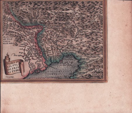 Carta geografica tratta dal ' Theatrum Orbis Terrarum, edizione francese. Originariamente la carta del Friuli compare in un foglio con il lago di Como - che deriva da quella di Paolo Giovio - e con la mappa del Lazio. Dal punto di vista cartografico si tratta di una derivazione della carta di Giovanni Andrea Vavassore, che rappresenta la più antica carta a stampa dell’area. Non è certa, come afferma parte della letteratura, la sua diretta derivazione dal manoscritto realizzato dal pittore udinese Giovanni Antonio Cortona, databile a prima del 1554. L’opera del Guadagnino, infatti, si mostra più accurata nella rappresentazione del rilievo montano, oltre ad un’evidente scrupolosità nella fitta riproduzione dei bacini dei tre fiumi maggiori, l’Isonzo, il Tagliamento e il Livenza. Le differenze maggiori con il modello del Cortona riguardano la toponomastica, infatti il Vavassore riporta solo i grandi centri abitati, castelli, abbazie, santuari e punti strategici di chiaraimportanza militare ed economica. Carta tratta dal ' Theatrum Orbis Terrarum ' e che è considerato il primo vero “atlante” moderno. L’opera fu pubblicata in 7 lingue e 36 edizioni, per il quale – nel 1570 - Ortelius ottenne il ' privilegio, ovvero una sorta di diritto d'autore che impediva ad altri cartografi di pubblicare i propri lavori. Il ' Theatrum ' rappresentava il lavoro più avanzato del lavoro della descrizione cartografica. L’Ortelius vi raccolse il sapere geografico e cartografico del suo tempo, proponendo in 147 spettacolari tavole incise l’immagine più fedele del mondo allora conosciuto e, in alcune straordinarie “carte storiche”, regioni e itinerari tratti dalla letteratura, dalla mitologia, dalla tradizione. Ortelius fu anche il primo a citare le fonti, menzionando i nomi dei cartografi nel “catalogus auctorum”. Dal 1598 al 1612 le edizioni postume del ' Theatrum ' furono realizzate dal suo collaboratore Johannes Baptiste Vrients. “Questa piccola carta del Friuli è inserita nella prima edizione del noto Thea/trum / Orbis/Terrarum di Abraham Oertel (Abrahamus Ortelius, da cui la comune denominazione italiana di Ortelio), apparsa ad Anversa nel 1570, nella quale costituisce la metà inferiore della facciata destra della tavola 35. Qui riproduciamo l'esemplare che abbiamo tratto dall'edizione del 1575, che si conserva presso la Biblioteca Generale dell'Università di Trieste (A.N. 2), ?upando la stessa posizione, però nell'ambito della tavola 46. Le due rappresentazioni sono identiche. Si tratta di una stampa da incisione in rame, delimitata da un rigo nero ed arricchita da una fascia ornata: essa misura mm 178x277. Nel cartiglio è riportato il titolo "FORI IV LII, VVL=/GO FRIV=/LI TYPVS.". Immediatamente sotto, nell'angolo a sinistra, c'è la dichiarazione del privilegio. L'orientazione non è indicata, ma è quella consueta. La scala, che è segnata in basso al centro, sopra il rigo marginale, è divisa in sette parti (= mm 64). Anche questa è una rappresentazione molto nota e molto citata, ma il solo ad averla accuratamente esaminata e studiata è stato il Cucagna. Abbiamo già ricordato come questa carta appartenga al filone che, per comodità, potremmo chiamare vavassoriano, ma che, tuttavia, vada ricondotta ad un modello più antico, che ci rimane ignoto. Ne dà chiara prova il suo stesso contenuto, perché se lo scheletro è uguale alla rappresentazione del La vera descritione Del Friuli di Giovanni Andrea Vavassori, non è difficile cogliere, rispetto ad essa delle notevoli divergenze nella nomenclatura e qualche novità nelle legende. "Queste divergenze - dice il Cucagna - sono di per sé già significative perché o si spiegano attribuendo all'Ortelio una discreta conoscenza della regione rappresentata e la capacità di cambiare la grafia di qualche toponimo, senza incorrere in errori; oppure possono già far sospettare che l'Ortelio non abbia avuto sott'occhio proprio la stampa del Vavassori". La do. Map taken from ' Theatrum Orbis Terrarum, French edition. Originally the map of Friuli appears in a sheet with Lake Como-derived from that of Paolo Giovio-and with the map of Latium. Cartographically it is a derivation of Giovanni Andrea Vavassore's map, which is the oldest printed map of the area. It is not certain, as some of the literature asserts, that it is directly derived from the manuscript made by the Udine painter Giovanni Antonio Cortona, which can be dated to before 1554. Guadagnino's work, in fact, is more accurate in its depiction of the mountain relief, as well as evident thoroughness in the dense reproduction of the basins of the three major rivers, the Isonzo, Tagliamento, and Livenza. The major differences with the Cortona model concern toponymy; in fact, Vavassore reports only the major settlements, castles, abbeys, shrines and strategic points of clear military and economic importance. Map taken from the ' Theatrum Orbis Terrarum, which is considered the first true modern "Atlas". The work was published in 7 languages and 36 editions, for which - in 1570 - Ortelius obtained the privilege, a kind of copyright that prevented other cartographers from publishing his works. The ' Theatrum ' represented the most advanced work of cartographic description. Ortelius collected in it the geographical and cartographic knowledge of his time, proposing in 147 spectacular engraved plates the most faithful image of the world then known and, in some extraordinary "historical maps", regions and routes taken from literature, mythology, tradition. Ortelius was also the first to cite sources, mentioning the names of cartographers in the "catalogus auctorum". From 1598 to 1612 the posthumous editions of the ' Theatrum ' were made by his collaborator Johannes Baptiste Vrients. “Questa piccola carta del Friuli è inserita nella prima edizione del noto Thea/trum / Orbis/Terrarum di Abraham Oertel (Abrahamus Ortelius, da cui la comune denominazione italiana di Ortelio),