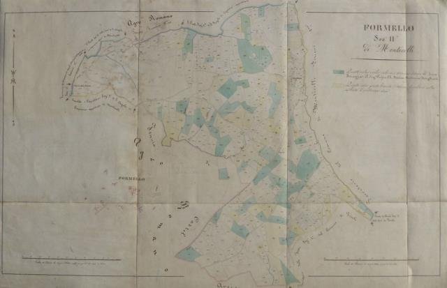 Cabreo 1840 circa, coeva coloritura a mano, cm 62,5 x 95 (il foglio), titolo manoscritto all'angolo superiore destro, sul lato sinistro una freccia indica il nord, scala di canne di doppio metro ai due lati del margine inferiore. Scrittura a inchiostro marrone, una legenda nell'angolo superiore destro spiega: “Questo color verde indica i terreni liberi di Sua Eccellenza il Sig. Principe D. Marco Antonio Borghese” e “Questo color giallo denota i terreni livellari alla Lodata Eccellenza Sua”. Bella pianta del territorio di Formello, in cui sono indicati in scrittura tutti i territori adiacenti, in senso orario: l'Agro Romano, il Territorio del Comune di Monticelli, la Tenuta di Castel Arcione nell'Agro Romano, Formello. Pieghe di origine, foglio controfondato, leggeri e sporadici segni di umido, buono stato di conservazione. .