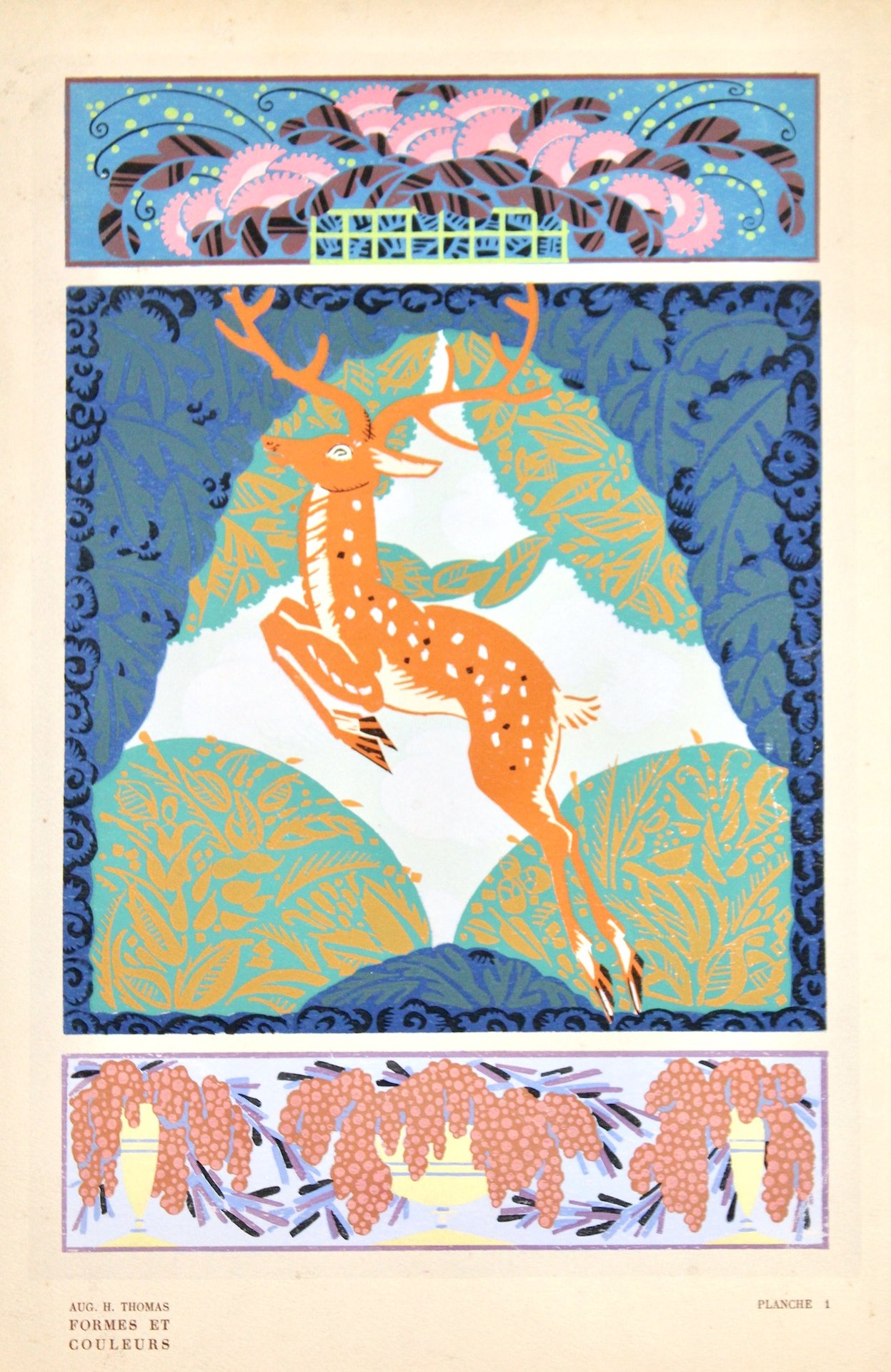 Pochoir originale a colori d'epoca, mm 390x260. Buon esemplare con piccoli difetti alle estremità dei margini.<BR>Cfr. L'arte decorativa dal Liberty al Déco. Natura fonte di ispirazione. <BR><BR>