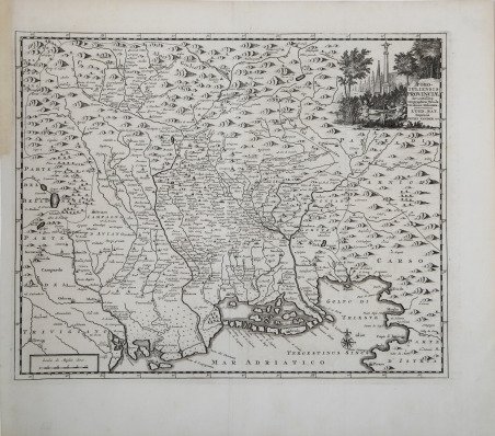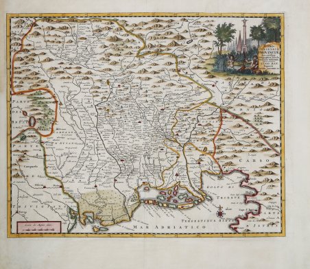 Mappa tratta da "Thesaurus Antiquitatum et Historiarum Italiae, Neapolis, Siciliae Sardiniaae, Corsicae and Melitae", opera monumentale di Georgius Graevius pubblicata nel primo quarto del XVIII secolo. Tra il 1704 e il 1725, i 45 volumi del "Thesaurus antiquitatum" furono stampati a Leida, una lavorazione complessa e laboriosa, esaltata da alcuni come straordinaria, criticata, invece, da altri, che ne parlarono come di una "compilation énorme sans choix e sans ordre". Un progetto che preoccupò molto i contemporanei, in Italia, ma interessò poco la storiografia successiva, che, salvo rari casi, ne sottolineò il carattere meramente accademico e la sostanziale inutilità. Tuttavia, l'opera di Graevius è arricchita dalle preziose tavole firmate dall'editore olandese Pieter Vander AA. Pieter van der Aa era nel 1682 proprietario di una libreria e di una casa d'aste. Durante la sua vita pubblicò un'enorme quantità di materiale stampato. Dopo il 1700, van der Aa si specializzò sempre di più in geografia e libri di viaggio. Pubblicò atlanti compositi, una serie di descrizioni geografiche di paesi europei e alcune opere molto spettacolari. Tra il 1706 e il 1708 pubblicò Naauweurige versameling der gedenkwaardigste zee- en land-reysen, in 28 volumi. Molte delle pubblicazioni di Van der Aa sono riccamente illustrate con mappe e tavole. Prese in consegna molte lastre di rame e stampe da altri editori come Carel Allard e Frederik De Wit. Gli atlanti compositi che uscirono dal suo laboratorio contengono una curiosa miscela del suo materiale, copie di mappe di altri editori e ristampe di vecchie lastre di rame, ora recanti la sua firma. La Galérie agréable du monde, completata nel 1729, comprendeva 66 parti, rilegate in 27 volumi. Van der Aa la presentò come un buon investimento; dopo la pubblicazione il valore antiquario dell'opera raddoppierà, soprattutto perché venne stampata in una tiratura limitata di soli cento esemplari. “Un rifacimento maginiano, già segnalato dal Valentinelli nella sua Bibliografia del Friuli al n. 10 e dal Saggio marinelliano al n. 1054, è la nitidissima stampa che qui riproduciamo per prima, di proprietà dell'Istituto di Geografia della Facoltà di Magistero di Trieste, la quale porta il nome di Pieter Van der Aa. Nell'angolo in alto, a destra, su una lapide si legge: "FORO (sic) IULIENSIS PROVINCIAE / Accuratissima / Geographica Tabula / Novissime Delineata./LUGD [onum] BAT[avorum] Impensis / PETRI VANDER AA.". Essa si trova unita all'opera di Palladio Enrico le oppugnatione gradiscana in Graevii thesaurus antiq.et histor. Ital. pubblicato nel 1722, e precisamente nella quarta parte del tomo VIo nella monumentale raccolta dello stesso Van der Aa intitolata La Galerie agréable du Monde les estampes avant ete dessinées sur les lieux et gravée ex?tement par les celébres Luyken, Mulder, Goerée, Baptist, Stapendaal, et par d'autres maitres renomez. le tant mis en ordre et execut é a Leide, par P. Vander Aa. Quest'opera, edita a Leida nel 1729, è abbastanza rara: sembra, infatti, che di essa siano stati tirati solo un limitato numero di esemplari. Per dare l'idea della mole di questo lavoro, aggiungiamo soltanto che è costituito da 66 tomi compresi in 20 o 27 volumi a seconda della legatura e che contiene oltre 3000 tavole. La carta misura mm 293x365. Ha un margine graduato di 1' in 1'. L'orientamento, che risulta indicata da una piccola rosa dei venti posta nel Golfo di Trieste, è quella consueta. La scala è di Miglia dieci (= mm 40). Riprodurre integralmente e con molta cura, tutti i toponimi e la loro grafia, quali erano apparsi nel disegno maginiano della Patria del Frivli olim Forum Ivlii, testimoniando la vitalità, che questo modello manteneva, a distanza di un secolo e nonostante la disponibilità di documenti migliori. Rispetto a questa carta rivela soltanto alcune piccole differenze formali, consistenti in un diradamento del rilievo, nella insignificante variazione d. Map taken from ' "Thesaurus Antiquitatum et Historiarum Italiae, Neapolis, Siciliae Sardiniaae, Corsicae and Melitae," a monumental work by Georgius Graevius published in the first quarter of the 18th century. Between 1704 and 1725, the 45 volumes of the "Thesaurus antiquitatum" were printed in Leiden, a complex, laborious generation, extolled by some as extraordinary, criticized, on the other hand, by others, who spoke of it as a "compilation énorme sans choix e sans ordre". A project that concerned contemporaries a great deal, in Italy, but interested little historiography afterwards, which, except in rare cases, emphasized its merely scholarly character and substantial uselessness. However, Graevius' work is enriched by the valuable plates signed by Dutch publisher Pieter Vander AA. Pieter van der Aa was by 1682 the owner of a bookstore and auction house. During his lifetime he published an enormous amount of printed material. After 1700, van der Aa specialized more and more in geography and travel books. He published composite atlases, a series of geographical descriptions of European countries, and some very spectacular works. Between 1706 and 1708 he published ' Naauweurige versameling der gedenkwaardigste zee- en land-reysen, in 28 volumes. Many of Van der Aa's publications are richly illustrated with maps and plates. He took over many copperplates and prints from other publishers such as Carel Allard and Frederik De Wit. The composite atlases that came out of his workshop contain a curious mixture of his own material, copies of maps from other publishers, and reprints of old copper plates, now bearing his signature. The ' Galérie agréable du monde, completed in 1729, comprised 66 parts, bound in 27 volumes. Van der Aa presented it as a good investment; after publication, the work's antiquarian value would double, especially since it was printed in a limited edition of only one hundred examples. “Un rifacimento maginiano, già segnalato dal Valentinelli nella sua 