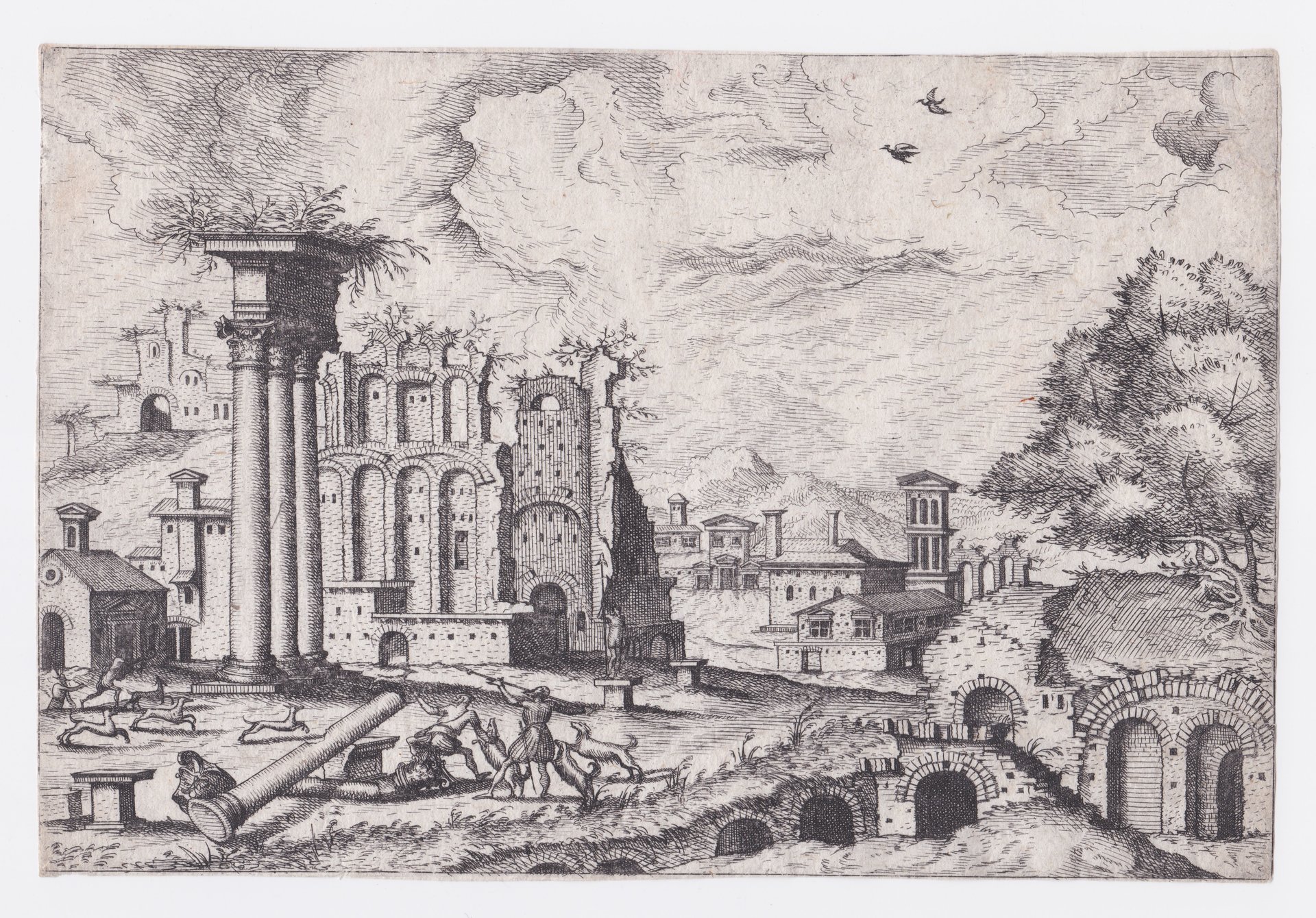 Questa stampa fa parte della serie Operum Antiquorum Romanorum, conosciuta anche con il titolo Il Piccolo libro delle Rovine Romane, derivata da disegni di autore ad oggi anonimo, è stata pubblicata inizialmente ad Anversa nel 1562 da Hieronymus Cock. Si conoscono altre tre edizioni: Amsterdam con indirizzo di Michiel Colijn con tavole nel I stato senza la numerazione; Amsterdam con indirizzo di Corbìnelis Danckerts I; Amsterdam con indirizzo di Frederick de Wit di sole 11 lastre nel II stato con la numerazione 1-12. La serie è composta dal frontespizio e da 2o incisioni raffiguranti animate vedute di antichità romane così come erano visibili all'epoca. In definitiva sono un interessante documento dell'epoca, non tutte le vedute sono riconducibili a località italiane. In questo foglio viene rappresentato il Foro romano quale scenografia per un episodio di caccia: quattro cacciatori seguiti da cani e armati di lance hanno accerchiato tre camosci. Diversamente dalle altre lastre della serie questa è nota in un solo stato, il primo, antecedente la numerazione.
