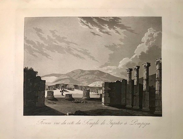 Acquatinta originale (cm. 32x26,5 più ampi margini bianchi) tratta dall’opera ‘Pompeia. Trattato pittorico, storico, e geometrico.’. Piccolo forellino al margine superiore bianco, altrimenti esemplare in ottimo stato di conservazione. Non comune.