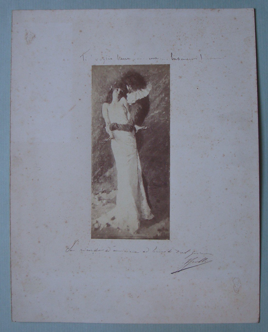 Irolli Vincenzo. Fotografia originale con dedica e firma autografa. S.l.n.d. Cm.17x7. Riproduzione di un suo quadro con dedica autografa firmata: ti voglio bene ma lasciami !!!