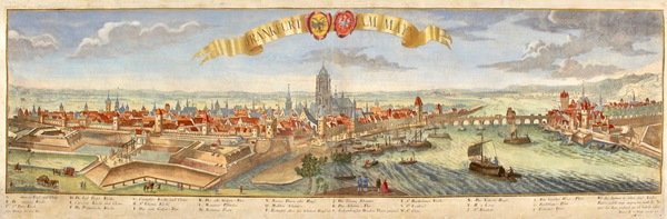 Incisione in rame in due lastre stampate su due fogli uniti editorialmente, impressi su carta vergata, firmata in lastra a destra Haered. Hyeremiae Wolffy. Mm 360x1070.<BR>Splendida veduta generale, coloritura posteriore, pubblicata dalla bottega di Wolff. Titolo al centro su nastro. In basso su 10 colonne, numerosi rimandi in tedesco A-Z e 1-3. <BR>Geremia Wolff fu editore specializzato nella pubblicazione di grandi vedute di città, come la presente. Alla sua morte gli eredi continuarono l'attività e furono tra i maggiori editori tedeschi di stampe nella prima metà del '700: la loro officina produsse incisioni di ogni genere fra cui le vedute ottiche e le grandi vedute di città europee, fra cui la presente, tutte ormai difficilmente reperibili sul mercato antiquario, considerata la misura e di consequenza il numero limitato di esemplari tirati. <BR>Esemplare assai fascinoso, qualche difetto e mancanza restaurati, essendo anticamente la stampa montata su tela (traccia di fori restaurati nei margini).<BR><BR>