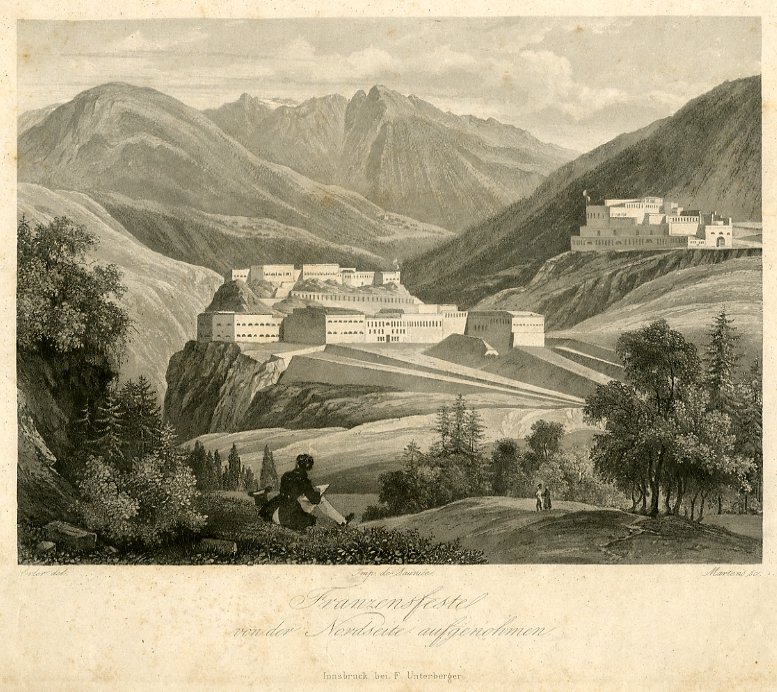 Incisione di dimensioni 145x195 mm. Condizioni : USATO - Stato : Buono, ordinari segni d'uso e del tempo. Lievi segni di foxing. Altre note : Veduta di Fortezza (Franzensfeste), nella Wipptal. L'enorme complesso fortificato che dà il nome al luogo fu voluto da Francesco I nel 1832: è costituito da tre sottostrutture collegate tra loro, il Forte Basso, il Forte Medio e il Forte Alto. Nella veduta la fortificazione, resa con segno preciso e nitido, è il soggetto principale: anche l'artista ritratto di spalle nel primo piano sembra intento ad osservarla e forse a riprodurla sul foglio che tiene fra le mani.