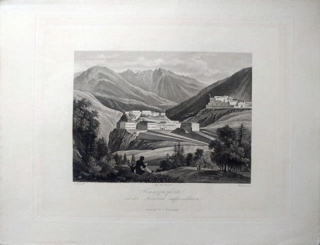 Innsbruck, 1840 circa. Incisione in rame all'acquatinta, b/n, cm 23 x 28,5 circa (alla lastra) più margini. Veduta disegnata dallo Erler e incisa da Frédéric Martens (1809 – 1875). Rara veduta della località altoatesina di Fortezza, con la costruzione alla base degli speroni rocciosi. Nonostante le dimensioni ridotte, Fortezza è un importante nodo ferroviario che unisce la ferrovia della Val Pusteria con la linea ferroviaria del Brennero, ovvero la Val Pusteria con la Val d'Isarco. Fino alla metà degli anni Novanta, Fortezza era un'importante dogana, specialmente per il suo scalo bestiame; ha perso questo ruolo dopo l'apertura delle frontiere, in seguito all'entrata dell'Austria nella Comunità Europea. Il paese prende il nome dalla fortezza che fu edificata ai tempi dell' impero austriaco, dal 1833 al 1838 e infatti il nome originario di Fortezza era “Franzensfeste” che significa “Fortezza di Francesco”. L'impero austriaco volle costruire un sistema difensivo per il timore delle invasioni da sud e Francesco I scelse questa località per la sua dislocazione geografica e strategica, proprio perché la valle si restringe; sul suo costone roccioso, che si protende dalla montagna, venne costruito un primo sistema. L’enorme complesso fortificato è costituito da tre sottostrutture collegate tra loro, il Forte Basso, il Forte Medio e il Forte Alto. Nella veduta la fortificazione è resa con segno chiaro e preciso e l’artista ritratto di spalle, in primo piano, sembra osservarla. L'importanza militare del luogo si era già resa evidente durante l'insurrezione tirolese del 1809, quando il Generale Lefebvre, al comando delle truppe sassoni, fu sconfitto in un'imboscata dai Tirolesi di Andrea Hofer. Il raffinato uso della tecnica dell’acquatinta permette una meticolosa distribuzione della polvere di bitume sulla lastra (passaggio cruciale in questa tecnica) la quale si risolve in tonalità morbide e tenui che conferiscono volume alla veduta. Uniforme lieve ingiallimento, buono stato di conservazione.