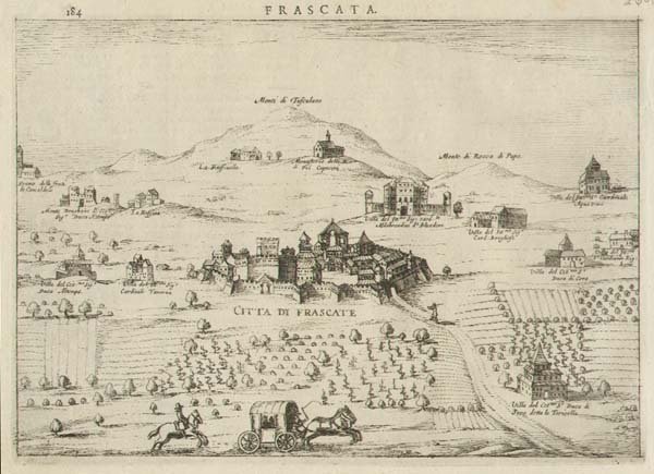 FRASCATI - Bella veduta generale del territorio con la città al centro, in primo piano una carrozza ed un cavaliere.