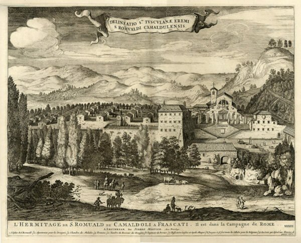 FRASCATI - MORTIER, Pierre. 1724. "Delineatio S.te Tuscolanae Eremi S. Romualdi Camaldulensis. L'Hermitage de S. Romuald de Camaldoli a Frascati. Il est dan la Campagne de Rome. A Amsterdam par Pierre Mortier Avec privilege". Titoli in alto entro cartiglio ed in basso lungo il margine inferiore. Bellissima veduta panoramica del convento, della chiesa e dintorni, con viandanti ed alberi in primo piano. Molto decorativa.