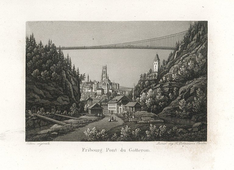 Stampa, antica ed originale, raffigurante Fribourg in raffinata acquatinta. Inserita nell'opera "Souvenir de la Suisse" edita a Zurigo. Autore: Dikenmann Rudolf dis. (1793 Zürich 1883). Luogo: Fribourg CH. Anno: 1860 ca. Tecnica: acquatinta. Dimensioni: 74x112 mmm