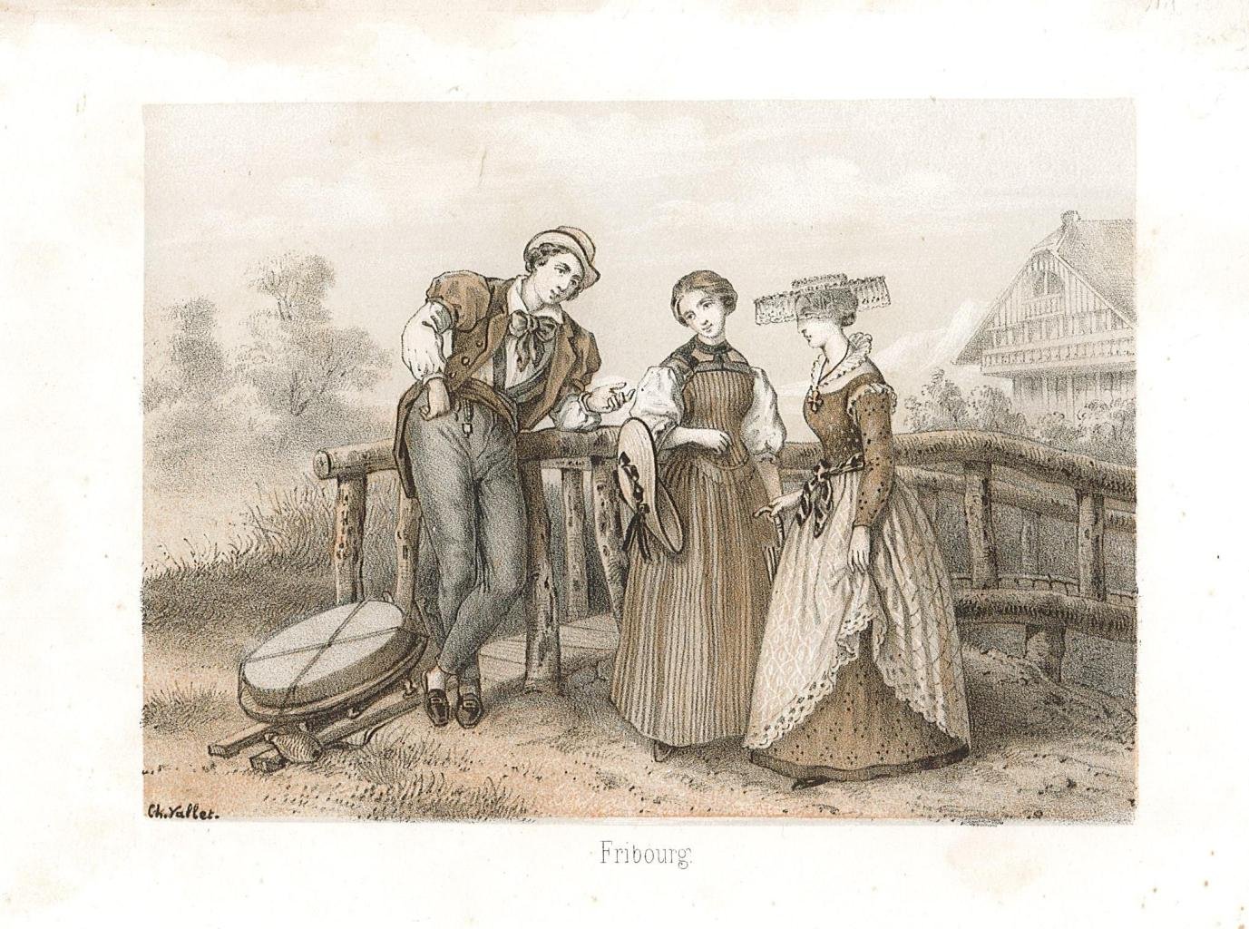 Veduta, antica ed originale, di caratteristici costumi svizzeri di Friburgo stampata a colori e stampata dalla litografia Lemercier di Parigi. Autore: Vallet Ch. Luogo: Costumi svizzeri. Anno: 1840 ca. Tecnica: litografia. Dimensioni: 102x135 mm