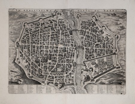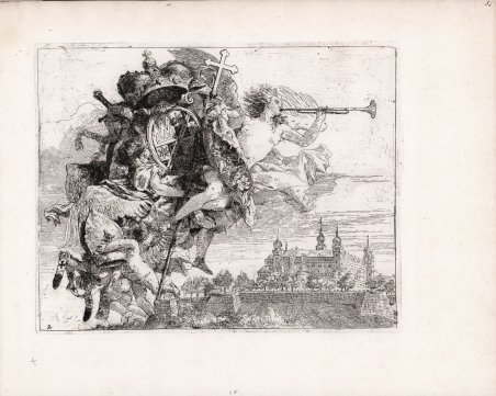 Acquaforte e bulino, 1753 circa. Esemplare nel secondo stato finale, con il numero 2 nell’inciso, in basso a sinistra. Magnifico esemplare, impresso su carta vergata filigranata, ampi margini oltre la linea del rame; eccellente stato di conservazione. Frontespizio della serie La Fuga in Egitto. Sullo sfondo della fresca citazione del castello di Würzburg il gruppo di angeli si libra in volo reggendo lo stemma del principe vescovo Karl Philipp von Greiffenklau. Il frontespizio è piuttosto raro perché inserito solo nella prima edizione del Catalogo (1774) di Giandomenico. La Fuga in Egitto, capolavoro acquafortistico di Giandomenico, comprende ventisette tavole: la dedica, il frontespizio e 24 acqueforti con scene della fuga. Senza dubbio nel concepimento della serie Giandomenico trasse ispirazione da opere paterne. Bibliografia Succi, II, pp. 538 -540, n. 45. Example in the second final state, with the number 2 added lower left in the image. Magnificent example, printed on laid paper watermarked, wide margins beyond the copper line; excellent condition. ' Frontispiece of the series La Fuga in Egitto (The Flight into Egypt). On the background of the fresh reference to the castle of Würzburg the group of angels hovers holding the coat of arms of Prince-Bishop Karl Philipp von Greiffenklau. The frontispiece is quite rare because it was only included in the first edition of Giandomenico's Catalogue (1774). ' La Fuga in Egitto, Giandomenico's etching masterpiece, includes twenty-seven plates: the dedication, the frontispiece and 24 etchings with scenes from the flight. Undoubtedly in conceiving the series Giandomenico drew inspiration from his father's works. Bibliografia Succi, II, pp. 538 -540, n. 45. Cfr.