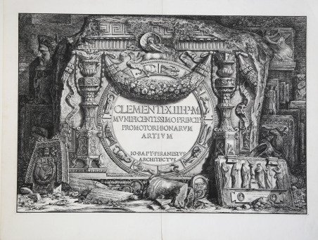 Acquaforte, 1764, firmata in basso a sinistra Piranesi inv e inc. Tra frammenti di decorazione architettonica, un lastrone di marmo riccamente intagliato e inghirlandato ha nel centro un medaglione com intorno i segni dello zodiaco e nel mezzo la dedica in rilievo: CLEMENTIS XIII PM/ MUNIFICENTISSIMO PRINCIPI/ PROMOTORI BONARUM/ ARTIUM /IO BAPT PIRANESIUS/ ARCHITECTUS Secondo frontespizio,a doppia pagina, dell’opera Le Antichità di Albano e di Castel Gandolfo Gli studi archeologici di Piranesi nella zona del lago di Albano, iniziati con il lavoro sull'Emissario, furono fortemente incoraggiati da papa Clemente XIII, la cui residenza estiva a Castel Gandolfo si affacciava sul lago. Su suggerimento di questo importante mecenate, che contribuì a sostenere le ingenti spese, l'artista realizzò un trattato particolarmente bello dedicato alle antichità locali e dedicato al Papa. In quest'opera, spesso legata alle opere sull'Emissario e sulle Due Spelonche, Piranesi estende la sua tecnica illustrativa che combina vedute evocative con grafici altamente tecnici, spesso speculativi, su aspetti dell'edilizia romana. Magnifico esemplare, impresso su carta vergata coeva, in ottimo stato di conservazione Etching, 1764, signed on plate at lower left: Piranesi inv e inc. Among the fragments of architectural decoration, a marble slab richly carved and englanded has in the center a medallion with around the signs of the zodiac and in the middle the dedication in relief: CLEMENTIS XIII PM/ MUNIFICENTISSIMO PRINCIPI/ PROMOTORI BONARUM/ ARTIUM /IO BAPT PIRANESIUS/ ARCHITECTUS Double-page dedication to Pope Clement XIII, from the work Le Antichità di Albano e di Castel Gandolfo Piranesi's archaeological studies in the area of Lake Albano, initiated by his work on the Emissario , were greatly encouraged by Pope Clement XIII whose summer residence at Castel Gandolfo overlooked the lake . At the suggestion of this major patron, who helped to defray the considerable costs, the artist produced a particularly handsome treatise devoted to the local antiquities and dedicated to the Pope. In this work, which is often bound with the works on the Emissario and the Due Spelonche , Piranesi extended his illustrative techniques of combining emotive vedute with highly technical , and often speculative , diagrams on aspects of Roman construction. Magnificent example, printed on contemporary laid paper, in excellent condition. Cfr. Wilton-Ely, 639; Focillon 506; Petrucci, n. 457