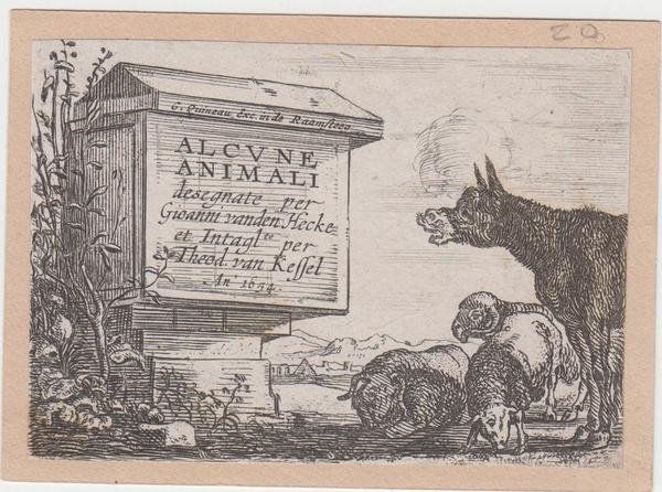 Frontespizio con titolo scritto su una costruzione in pietra (tomba?) A sinistra, un asino e tre pecore a destra; dopo Jan van den Hecke. 1654, acquaforte incollata al margine inferiore su cartoncino dimensioni cm. 10,2 x 7,1