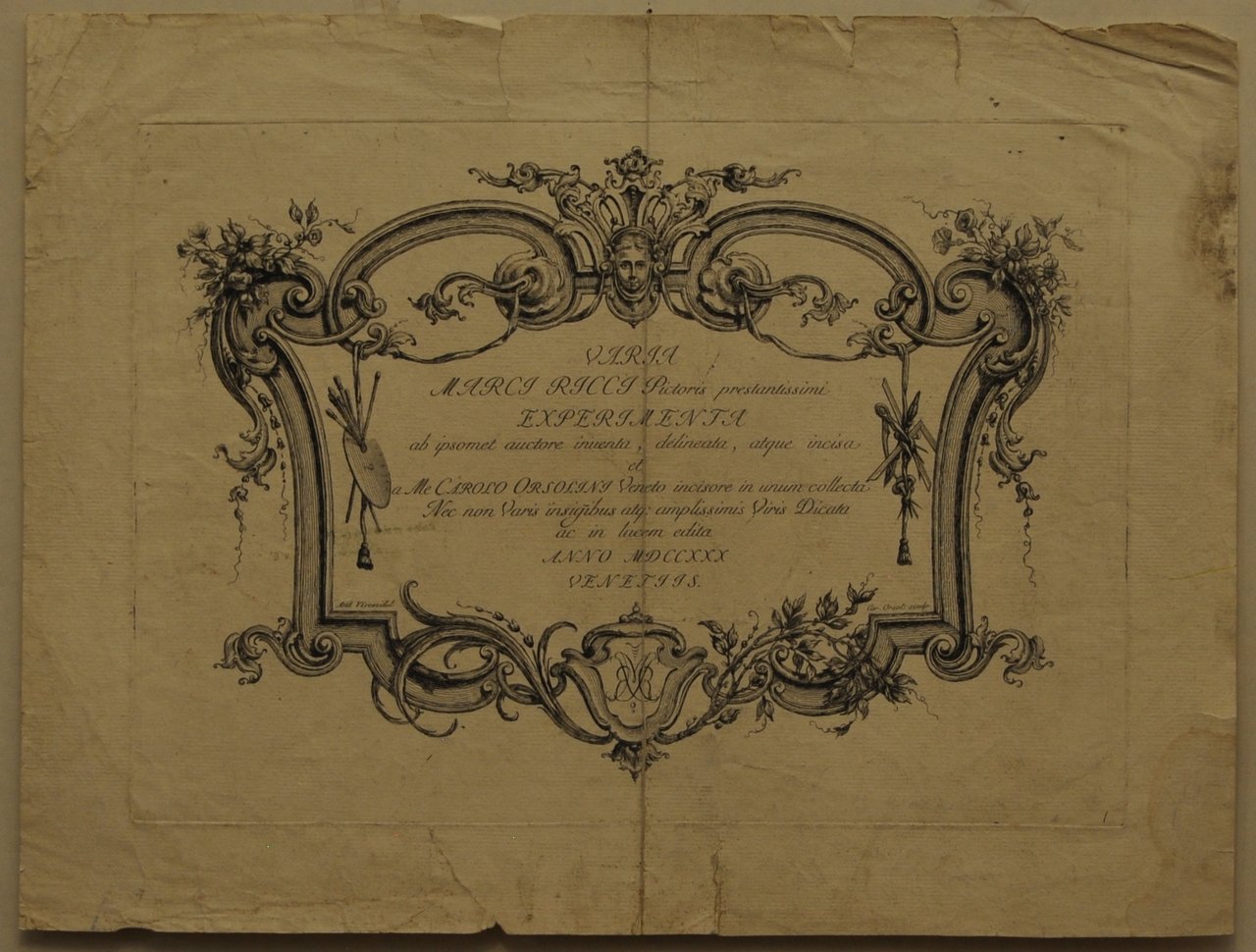 Incisione calcografica di mm 304 x 430 , su carta veneziana, con buoni margini. Foglio in discrete condizioni. Frontespizio del famoso album di Marco Ricci.