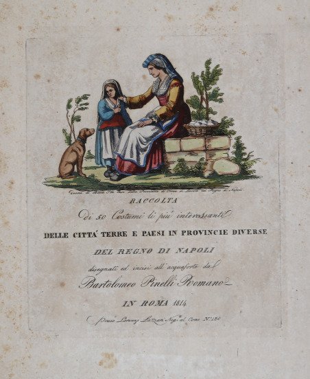 Frontespizio tratto dalla rara Raccolta di 50 costumi li più interessano delle città, terre e paesi in province diverse del Regno di Napoli, stampata a Roma nel 1814. ' Incisione in rame, in buono stato di conservazione. Rara. ' Title page from the rare series ' Raccolta di 50 costumi li più interessano delle città, terre e paesi in province diverse del Regno di Napoli, printed in Rome in 1814. ' Copperplate, in excellent condition. Rare. Cfr.