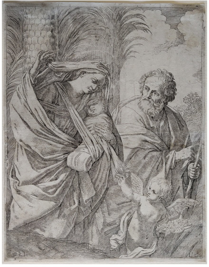 In questa grande stampa, tratta da un'invenzione di Guido Reni, viene rappresentata all'interno di un paesaggio la Sacra Famiglia in fuga. Sotto delle alte palme, sulla sinistra, vediamo la Vergine vestita con un abito riccamente panneggiato mediante forti contrasti chiaroscurali che regge avvolto tra le fasce il Bambin Gesù dormiente. Alle sue spalle San Giuseppe, un uomo anziano dalla barba e dai capelli bianchi, assiste premuroso alla scena intima, colma di amore. In basso sulla destra un putto dona un fiore a Maria preso dal vassoio che regge nella mano sinistra. In basso a sinistra "G.R.IN" e a destra "L.Loli". Tutta la composizione è giocata su una ricerca di luci che creano un effetto grigio-argenteo conferendo solennità alla scena.