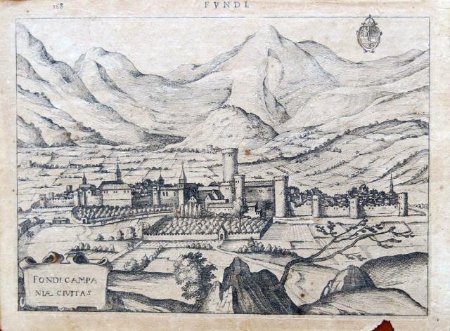 Leida, 1630 circa. Tratta da “Nova et Accurata Italiae Hoderniae Descriptio” (Leida, Bonaventura - A. Elsevir, 1627), incisione in rame all’acquaforte, cm 18 x 25 (alla lastra) più margini, numero 168 in alto a sinistra, testo latino al verso. Ravvicinata veduta della città, fortezza e castello di Fondi con i monti circostanti. Rara. L’Olandese Josse de Hondt, che latinizzò il proprio nome in Jodocus Hondius, diede inizio a una generazione di editori, soprattutto operanti in ambito geografico, la cui attività fu continuata dal figlio Henricus e dal genero J. Jannsonius. Uniforme ingiallimento del foglio con due piccoli punti di ossidazione, una piccola mancanza della carta al margine inferiore, peraltro ben impressa e ben distesa.