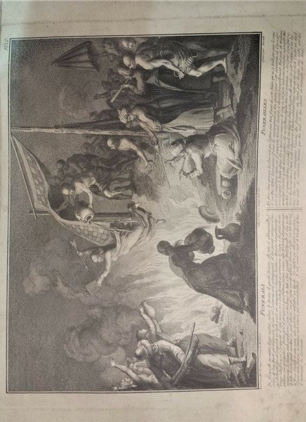Incisione calcografica di mm 380 x 315 alla battuta su carta vergellata veneziana, ampi margini. Foglio tratto dall'opera :"Raccolta dei riti, e ceremonie religiose di tutti i popoli del mondo, con la spiegazione storica italiana e francese per cadauna ceremonia", a sua volta ricavata da quella stampata ad Amsterdam da Bernard Picart. Il foglio illustra i funerali presso gli Indiani e riporta in italiano e francese la seguente descrizione "In forza di un'antica Legge restano infami le Donne di questa Nazione, che non si abbrucciano col corpo de' loro Mariti già trapassati. Ad una tal Ceremonia sono accompagnate dà loro parenti, ed amici al luogo destinato. Ivi stà preparato un lauto pasto ove mangiano, e bevono, cantando, e danzano tranquillamente. Presso alla fossa, ov'è preparato il rogo acceso, vi è anche formata una emminenza di cinque o sei piedi, su cui salgono per precipitarsi. Prima però di giungere a quest'ultima azione, vanno alla Riviera, depongono ogni ornamento, si lavano, onde purificarsi (come pretendono) da tutti i loro peccati. Indi ravolte in una veste di tella di color giallo montano su quell'altezza, ove gli viene versato addosso un vaso d'oglio, e si lanciano nella fossa tenendo in una mano uno specchio, e nell'altra un dardo. Per togliere poi alle men coraggiose l'orrore delle fiamme, vi tendono una stuoia per nascondergliele. E con suoni e canti di trionfo, e di duolo terminano la Ceremonia".