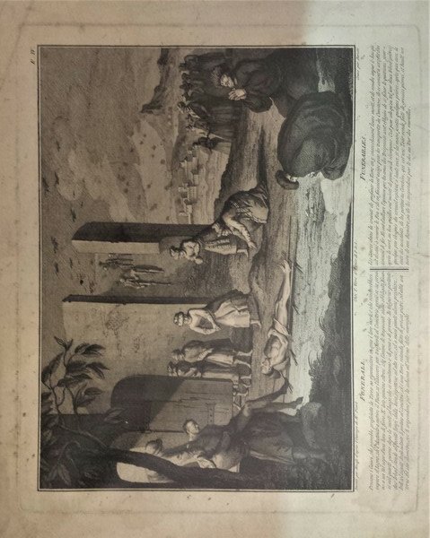 Incisione calcografica di mm 380 x 315 alla battuta su carta vergellata veneziana, ampi margini. Qualche piccolo strappo laterale. Foglio tratto dall'opera :"Raccolta dei riti, e ceremonie religiose di tutti i popoli del mondo, con la spiegazione storica italiana e francese per cadauna ceremonia", a sua volta ricavata da quella stampata ad Amsterdam da Bernard Picart. Il foglio riporta in italiano e francese la seguente descrizione "Pensano i Gauri, che verrebbe profanata la Terra se riponessero in essa i loro morti; e che renderebbesi impuro il Legno, ch'è destinato a nutrire il Fuoco, se l'usassero per trasferirli al Cemeterio, perciò se ne servono a un tal uopo d'una bara di ferro. E' loro opinione altresì, che l'anime de trapassati siano obbligate fissardi nel quarto giorno dopo la morte, al luogo che si meritarono o di pena o di premio. In tal giorno pertanto due Irbad, stando alquanto lungi dalla bara, ripettono ad alta voce, ed a mani giunte alcune preghiere. Indi col seguito degli astanti li portano al Cemeterio, ch'è una Torre rotonda fatta di grosse pietre, ed alta un terzo del suo diametro, ove li sospendono per la schiena all'intorno delle muraglie".
