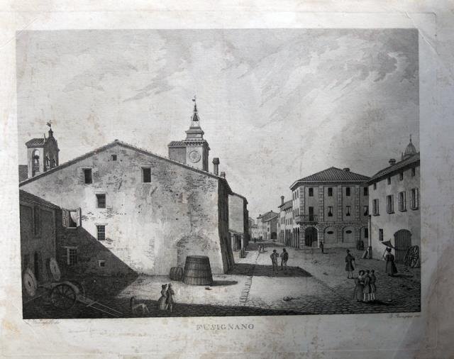 1835 circa. In basso a destra”B. Rosaspina inc.”, in basso a sinistra “ L. Ricciardelli dis.”. Incisione in rame all'acquaforte, cm 32,8 x 42 (alla lastra) più margini. Il foglio fa parte di una serie di tavole realizzate da Bernardo Rosaspina, dal titolo “Ventisette incisioni rappresentanti diversi luoghi della Romagna disegnati” e stampate in anni diversi tra il 1830 e il 1840. Bernardino Rosaspina (Bologna 1797 – Bologna 1882), appartenente ad una celebre famiglia di incisori, era figlio di Giuseppe (Bologna 1765 – ivi 1832), e nipote di Francesco (Montescudo, Rimini, 1762 – Bologna, 1841). Bernardino, conosciuto anche come Bernardo, si concentrò nella realizzazione di vedute che divennero presto apprezzate e richieste per la pulizia del tratto. Esemplare con una leggera ma diffusa patina di sporco ai margini e in alcune zone dell’inciso, comunque in buona impressione. .