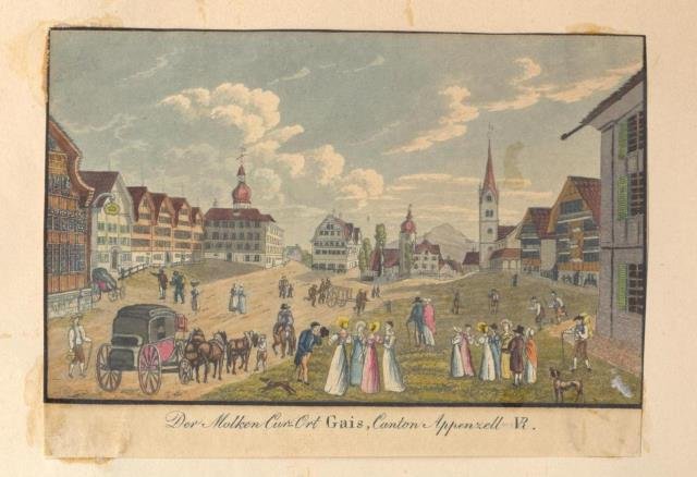 1840 circa. Piccola veduta in delineato, colore d'epoca ad acquarello e gouache, cm 8 x 10 circa ciascuna. Rifilate al margine del filetto nero di inquadratura, raffinata coloritura, discreto stato.