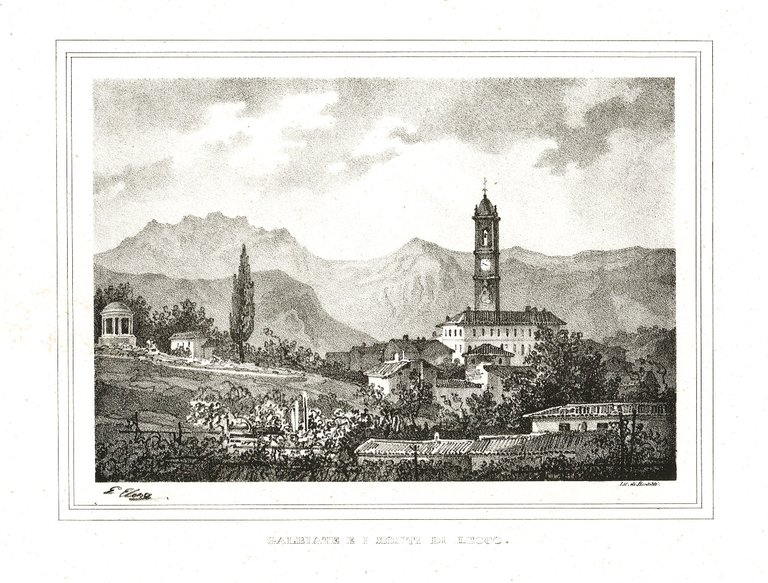 Stampa antica ed originale con veduta del paese con i monti sullo sfondo
