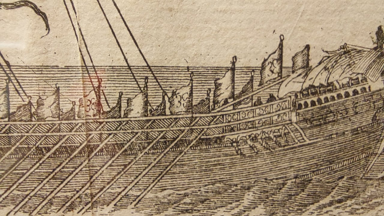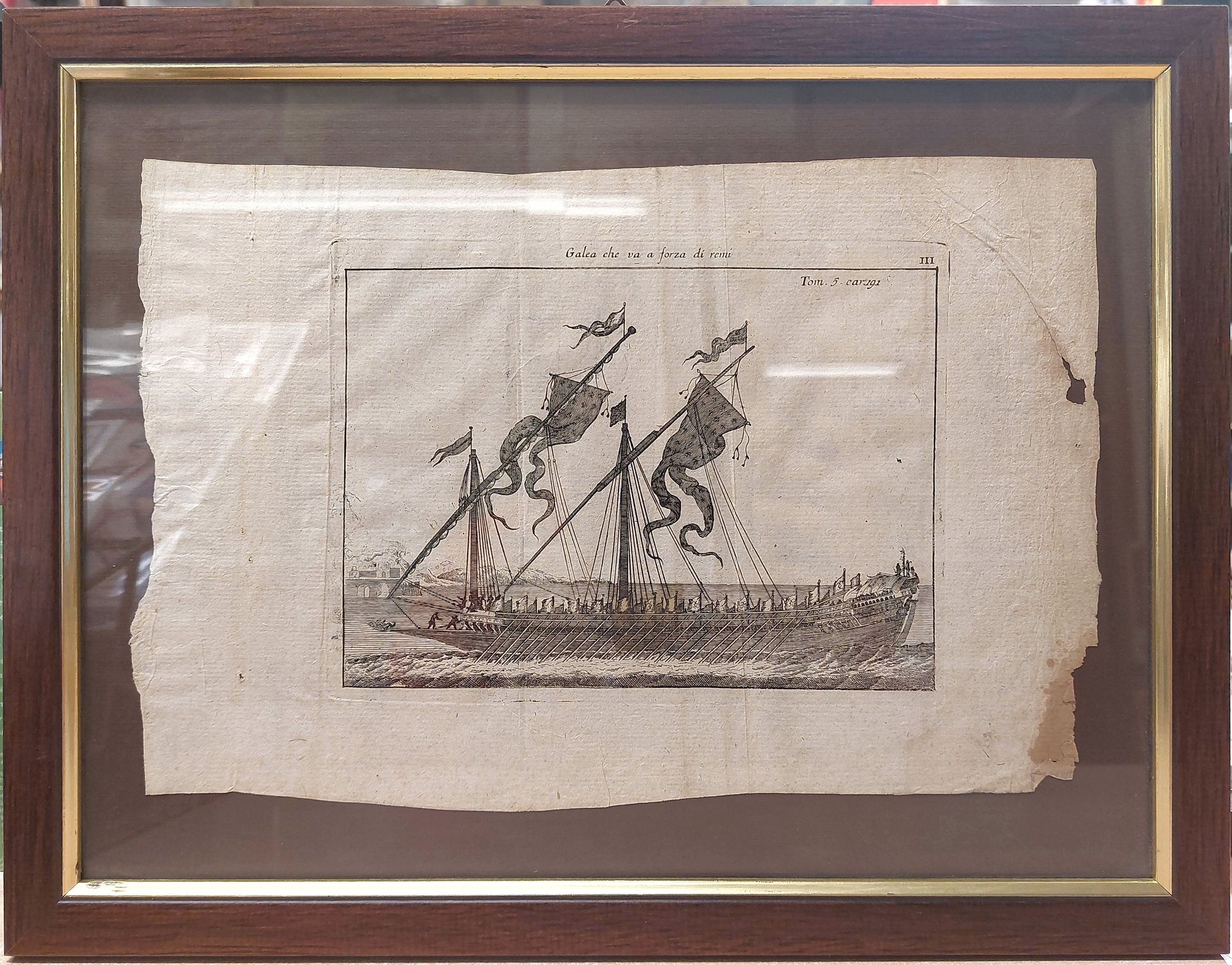 Incisione originale su rame (cm. 26,5x18,5, incorniaciato cm.34x26,3). Raffigura una galea che va a forza di remi (incisione III, Tom. 5). Proveniente dal trattato in nove volumi "Le Spectacle de la Nature" di Noël Antoine Pluche (1688-1761, scrittore e naturalista francese). Considerato un grande trattato di divulgazione scientifica che fù. tradotto in tutta Europa e influenzò molti a diventare naturalisti. Si riscontra una leggera macchia di umidità al lembo destro.