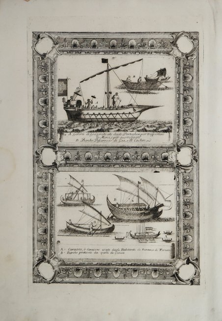 Elegante incisione all’acquaforte che mostra diverse navi utilizzate in Portogallo, Goa, Cochin, Bantan, Ternate e Giava, all'interno di una ricca cornice decorativa. Esemplare tratto dall’ Atlante Veneto, Nel quale si contiene la Descrittione Geografica, Storica, Sacra, Profana e Politica degli Imperi, Regni, Provincie, e Santi dell’Universo […] In Venetia MDCXC. Coronelli visse un periodo di straordinaria fecondità editoriale a partire dal 1689, quando ebbe la cattedra di geografia presso l'Università alle Procuratie, con la pubblicazione, nel 1690, del primo volume dell'Atlante Veneto. In effetti sotto il nome di ' Atlante Veneto ' va tutta la raccolta di tredici opere composte nell'arco del decennio successivo, dall'Isolario ' allo ' Specchio del mare. L'opera era intesa come un'estensione dell'Atlas Maior di Blaeu. Non è una semplice raccolta di mappe, ma piuttosto "un compendio di informazioni geografiche, cosmografiche e scientifiche. sulla scienza e la geografia italiana contemporanea" (Scammell). Oltre alle mappe, il primo volume include molte delle celebri tavole navali di Coronelli, molte con i bordi "farnesiani" stampati separatamente e commissionati appositamente dal patrono di Coronelli, Ranuccio II Farnese, duca di Parma. Incisione in rame, magnifica prova, con pieni margini, in perfetto stato di conservazione. Bibliografia Ermanno Armao, ' Vincenzo Coronelli ' (Firenze, 1944), nn.59-60, p.237. Etching engraving showing ships used in Portugal, Goa, Cochin, Bantan, Ternate, Java, within rich decorative frame. Example taken form Corenelli’s Atlante Veneto, Nel quale si contiene la Descrittione Geografica, Storica, Sacra, Profana e Politica degli Imperi, Regni, Provincie, e Santi dell’Universo […] In Venetia MDCXC. Coronelli lived a period of extraordinary editorial fecundity starting from 1689, when he had the chair of geography at the University at the Procuratie, with the publication, in 1690, of the first volume of the ' Atlante Veneto. Under the name of ' Atlante Veneto ' goes the entire collection of thirteen works composed over the next decade, from the ' Isolario ' to the ' Specchio del mare. The work was intended as an extension of Blaeu’s ' Atlas Maior. It is no mere ' collection of maps, but rather “a compendium of geographical, cosmographical, ' and scientific information. on contemporary Italian science and geography” ' (Scammell). As well as maps, the first volume includes several of Coronelli’s celebrated naval plates, many with the separately-printed “Farnese” borders especially commissioned by Coronelli’s patron, Ranuccio II Farnese, Duke of ' Parma. Copperplate, with full margins, very good condition. Very rare. Literature Ermanno Armao, ' Vincenzo Coronelli ' (Florence, 1944), no.59, no.60 and p.237. Cfr.