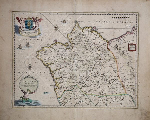 Bellissima carta della Galizia e nella regione nord-occidentae della Spagna. La carta è contenuta nell'Atlas Novus del Blaeu. Willem Janszoon Blaeu, avviò nel 1599 la sua attività di costruttore di globi e strumenti astronomici ad Amsterdam. Nel 1630, dopo aver comprato alcune lastre dell’atlante del Mercator da Jodocus Hondius II, fu in grado di pubblicare un volume di 60 mappe con il titolo di ' Atlantis Appendix. Cinque anni dopo, pubblicò i primi due volumi del suo atlante ' Atlas Novus ' o ' Theatrum Orbis Terrarum, ' in sei libri. Dopo la sua morte, Joan (Johannes) continuò l’opera paterna, completando l’intera serie di sei volume dell’Atlas Novus ' intorno al 1655. Fu inoltre autore di un ' Atlas Maior sive Cosmographia Blaviana, in 12 volumi pubblicati nel 1662 -72. Incisione in rame, coloritura coeva, restauri nei margini, per il resto in buone condizioni. Beautiful map of the Northwestern Coast of Spain, extending from the Asturias de Oviedo region and Aviles in the Northeast to Bayona and the Portugese border on the South, centered on Santiago di Compostella. Major cities include Corunna, Mondonnedo, Rivadeo, Lugo, Oresn, Pontevedra, and Padron. Shows castles, walled cities, towns, rivers, mountains and many other details. Large decorative cartouche with coat of arms held aloft by 2 cherubs, Neptune carrying title cartouche, 3 sailing ships, one sea monster and two compass roses. Willem Janszoon Blaeu, started in 1599 his business as a builder of globes and astronomical instruments in Amsterdam. In 1630, after buying some plates of the Mercator atlas from Jodocus Hondius II, he was able to publish a volume of 60 maps under the title ' Atlantis Appendix. Five years later, he published the first two volumes of his atlas ' Atlas Novus ' or ' Theatrum Orbis Terrarum, in six books. After his death, Joan (Johannes) continued his father's work, completing the entire six-volume ' Atlas Novus ' series around 1655. He was also the author of an ' Atlas Maior sive Cosmographia Blaviana, in 12 volumes published in 1662 -72. Cfr.