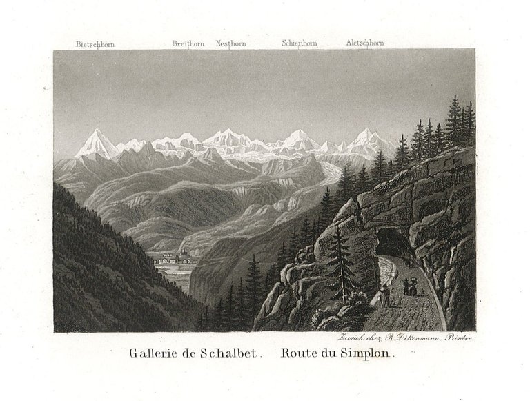 Stampa, antica ed originale, raffigurante la strada del Sempione in raffinata acquatinta. Inserita nell'opera "Souvenir de la Suisse" edita a Zurigo. Autore: Dikenmann Rudolf dis. (1793 Zürich 1883). Luogo: Sempione. Anno: 1860 ca. Tecnica: acquatinta. Dimensioni: 74x112 mm