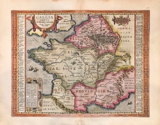Carta geografica originale (cm. 47x36 più ampi margini bianchi) tratta dal ‘Theatrum Orbis Terrarum’. Splendida coloritura antica all’acquarello. Esemplare in ottimo stato di conservazione. Provenienza: Biblioteca del Castello di Cirey. Van den Broecke, 194.