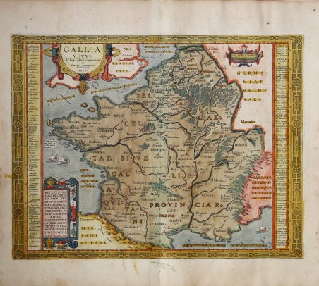 Splendida carta storico-geografica dell’antica Gallia, pubblicata nel ' Parergon ' di Abraham Ortelius. Esemplare dalla rara edizione italiana del Theatrum Orbis Terrarum stampata ad Anversa da Jean Baptiste Vrients nel 1608 e quindi nel 1612. Un secondo stato (di tre) della lastra; nel 1595 furono aggiunti alcuni nomi topografici: vicino ai Pirenei: "Elu:|sates" e "Ausci", a sud di Parigi "Drui:|dum sedes" diventa "Druidum sedes". "Agendi:cum" è stato aggiunto a nord-est della voce precedente. È stato aggiunto "Cavillonum" vicino a Lussemburgo. Titolo: GALLIA | VETVS, | "Ad Iulij Cæsaris commentaria. | ex | Conatibus geographicis | Abrah. Ortelij. | 1590". Cartiglio in alto a destra: "Cum Imp. Reg. et cancellariæ | Brabantiæ priuilegio decennali". Cartiglio in basso a sinistra: REVERENDIS:|SIMO IN CHRIS:|TO PATRI, DO:|MINO D. LAEVI:|NO TORRENTIO, | EPISCOPO ANT:|VERPIENSI, A:|PVD AMBIVA:|RITOS, | EIVS VIRTVTIS | CVLTOR ABRAH. | ORTELIVS REG. | MAIEST. GEOGRA:|PHVS DEVOTIS:|SIME DEDICAB. [Abraham Ortelius, geografo reale di Sua Maestà, dedica [questa carta] con devozione al signore e maestro, altamente lodato in Cristo, Lævinus Torrentius, vescovo di Anversa per il popolo Ambivirato, adorando le sue virtù]. Con un elenco delle tribù e dei popoli di quelle tribù citate per nome negli scritti di Cesare (bordo sinistro) e delle tribù (bordo destro) della Gallia, come descritte da Cesare. Realizzata da Ortelius sulla base di antiche informazioni tratte dal De Bello Gallico di Cesare. Il testo si apre dicendo che questa carta si basa solo sui commenti di Cesare, il che è vero per la carta ma non per il suo testo; il testo promette inoltre di terminare la discussione sui Druidi per passare ad altri argomenti, ma in realtà si fa riferimento a un gran numero di altre fonti testuali accanto a Cesare. Circa una decade dopo la pubblicazione del “moderno” Theatrum Orbis Terrarum, Ortelius rispose alle “preghiere di amici e studiosi di storia antica, sacra e profana” e compilò una serie di mappe di soggetto biblico e classico, quasi tutte disegnate da lui. Intitolò l’opera “Parergon theatri”, ovvero “aggiunta, appendice, del Theatrum”, ma al tempo stesso anche complementare al Theatrum: il Paregon theatri forniva per il mondo antico lo stesso materiale che Ortelius aveva fornito per il mondo moderno con il Theatrum: carte geografiche. Lo spirito del Parergon è tutto riassunto nel motto historiae oculus geographia riportato sul frontespizio: la geografia è l’occhio della storia. Le mappe del mondo antico avevano lo scopo di “rendere più chiari gli storici antichi e i poeti”. Le mappe del Paregon sono di tre tipologie: antiche regioni; carte letterarie e carte bibliche. Come sottolinea Koeman “il Parergon deve essere considerato come lavoro personale di Ortelius. Per quest'opera, infatti, diversamente dal Theatrum, non copiò le mappe di altri cartografi, ma ne disegnò lui stesso di nuove ed originali. Riprese luoghi, regioni e territori delle civiltà classiche illustrandone e spiegandone la storia, una materia molto vicina al suo cuore. Le mappe e le lastre del Parergon devono essere valutate come le più importanti incisioni che rappresentano il diffuso interesse per la geografia classica nel XVI secolo”. Esemplare con magnifica coloritura coeva, carta leggermente brunita, per il resto in ottimo stato di conservazione. Bibliografia Cfr. L. Bagrow, A. Ortelli Catalogus Cartographorum; cfr. C. Koeman, Atlantes Neerlandici; Peter H. Meurer, Fontes Cartographici Orteliani 18p; M. Van den Broecke, Ortelius Atlas Maps, n. 194 II/III; Van der Krogt, Koeman’s Atantes Neerlandici: 4000H:31A. Splendid historical map of the ancient Gallia, published in Abraham Ortelius' Parergon. Example from the rare Italian edition of Theatrum Orbis Terrarum printed in Antwerp by Jean Baptiste Vrients in 1608 and then in 1612. A second state (of three) of the plate; in 1595, a number of topographical names were added: near the Pyrenees: "Elu:|sates" and "Ausci", south of Paris "Drui:|dum sedes" becomes "Druidum sedes." "Agendi:cum" has been added just Northeast of the previous item. "Cavillonum" has been added near Luxemburg. Title: GALLIA | VETVS, | "Ad Iulij Cæsaris commentaria. | ex | Conatibus geographicis | Abrah. Ortelij. | 1590". [Ancient France as it appears in Iulius Cæsar's Comments, from the geographical efforts of Abraham Ortelius, 1590.] Cartouche top right: "Cum Imp. Reg. et cancellariæ | Brabantiæ priuilegio decennali". Cartouche lower left: REVERENDIS:|SIMO IN CHRIS:|TO PATRI, DO:|MINO D. LAEVI:|NO TORRENTIO, | EPISCOPO ANT:|VERPIENSI, A:|PVD AMBIVA:|RITOS, | EIVS VIRTVTIS | CVLTOR ABRAH. | ORTELIVS REG. | MAIEST. GEOGRA:|PHVS DEVOTIS:|SIME DEDICAB. [Abraham Ortelius, his majesties royal geographer, dedicates [this map] in devotion to the lord and master, highly praised in Christ, Mr. Lævinus Torrentius, bishop of Antwerp for the Ambivirate people, adoring his virtues]. With a list of tribes and people of those tribes mentioned by name in Cæsar's writings (left edge) and tribes (right edge) in Gallia, as described by Cæsar. Made by Ortelius on the basis of ancient information from Cæsar's De Bello Gallico. The text opens by saying that this map is only based on Cæsar's commentaries, which is true for the map but not for its text; the text also promises to finish the discussion on the Druids to turn to other matters, but in fact a great number of other text sources next to Cæsar are referred to as well, and the text is entirely devoted to the Druids. The Parergon is the first historical atlas ever published. It was initially conceived by Ortelius as an appendix to his Theatrum Orbis Terrarum but given the considerable success of these historical maps it later became an independent work and remained the main source of all similar works throughout the seventeenth century. Koeman wrote: “This atlas of ancient geography must be regarded as a personal w