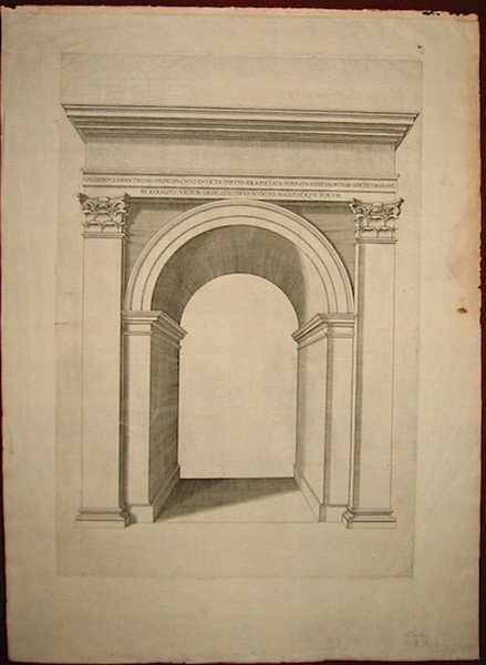Incisione originale su rame (cm. 30,5x44 più ampi margini bianchi). Carta vergellata con filigrana. Esemplare in ottimo stato di conservazione. Unico stato conosciuto. Arrigoni-Bertarelli, n. 417. Rubach, n. 271. Ricostruzione ad un fornice solo dell’Arco edificato da Augusto in luogo di una delle porte delle antiche Mura Serviana, la ‘Porta Esquilina’, e dedicato all’Imperatore Gallieno e a sua moglie Salonina da un semplice cittadino (M. Aurelius Victor) nel 262 d.C. Antoine Lafrery (Antonio Lafreri nella forma italianizzata), incisore, editore e mercante di stampe curò la pubblicazione tra il 1544 ed il 1575 di una serie di circa 200 incisioni - raffiguranti perlopiù monumenti ed antichità romane ed opera di diversi autori - nota come ‘Speculum Romanae Magnificentiae’. Le stampe erano poste in vendita sia singolarmente che sotto forma di raccolta con un numero spesso variabile di fogli. Dal 1574 iniziò a circolare anche una tavola-frontespizio dello ‘Speculum’, attribuita a Etienne Duperac. Successivamente, tra il tardo Cinquecento ed il Settecento, i rami lafreriani conobbero tirature posteriori con l’imprint di vari editori ed il contributo di diversi incisori. Inoltre lo ‘Speculum’ fu ampliato nel tempo mediante l’aggiunta di altre tavole il cui minimo comune denominatore appare quello di riprodurre opere antiche e moderne di Roma.