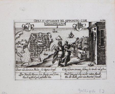 Veduta tratta dall'edizione del 1678 della celebre ' Sciagraphia Cosmica ' nota anche con il titolo ' Das ist Newes Emblematisches Buechlei, dainen in acht Centurijs die vornembste Stat, Vestung, Schlosser der ganzen Welt. ' stampata a Norinberga. La ' Sciagraphia Cosmica, venne ampliata sotto la supervisione di Kieser dopo la morte di Meisner nel 1625, arrivando quindi ad una composizione di 800 magnifiche incisioni. ' Ogni opera è caratterizzata da un motto sopra l'immagine, e da versi emblematici (in latino o tedesco). L'opera è la combinazione di due generi allora popolari, il libro degli stemmi e il "Teatro delle città". Tra i maestri incisori e miniatori che contribuirono a questa serie ci sono Matthäus Merian, Sebastian Furck, Christian Stimmer e forse anche Meisner stesso, che concepì l'opera e contribuì a buona parte della prosa. ' Incisione in rame, con margini, in perfetto stato di conservazione. View taken from the 1678 edition of the famous ' Sciagraphia Cosmica ' also known with the full title ' Sciagraphia Cosmica: ' Das ist Newes Emblematisches Buechlei, dainen in acht Centurijs die vornembste Stat, Vestung, Schlosser der ganzen Welt. printed in Nuremberg. The ' Sciagraphia Cosmica, was expanded under the supervision of Kieser after the death of Meisner in 1625, thus arriving at a composition of 800 magnificent engravings. ' Each engraving is characterized by a motto above the image, and by emblematic verses (in Latin or German). The work is a combination of two then-popular genres, the book of coats of arms and the "Town Book". Among the master engravers and illuminators who contributed to this series are Matthäus Merian, Sebastian Furck, Christian Stimmer, and perhaps Meisner himself, who conceived the work and contributed much of the prose. ' Copperplate engraving, with margins, in perfect condition. Cfr.