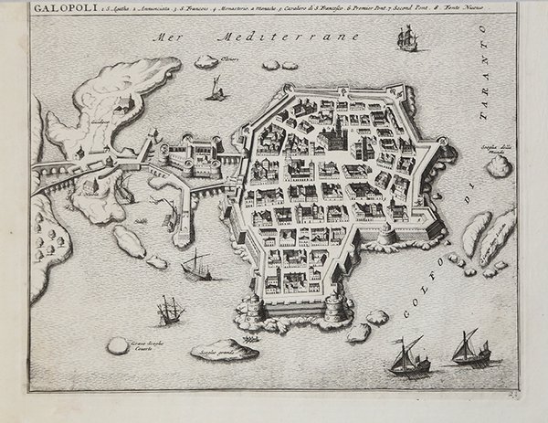 Opera per la prima volta pubblicata nel ' Theatrum Civitatum et admirandorum Italiae, stampato da Johannes Blaeu ad Amsterdam nel 1663. Esemplare tratto dal ' Nouveau Theatre de l'Italie ' pubblicato ad Amsterdam nel 1704/5 da Pierre Mortier e ristampato da R. Alberts nel 1724. Johannes Blaeu, durante la sua lunga attività editoriale pubblica tre volumi sulle città italiane. Nel 1663 i primi tre, suddivisi in Stato della Chiesa, Roma e Regno di Napoli e Sicilia. Alla sua morte i suoi eredi danno alla luce altri due volumi datati 1682 incentrati sulle città del Piemonte e della Savoia, poi ristampati da altri editori nel 1693 e 1697. ' Il francese Pierre Mortier pubblica una ristampa nel 1704/5, intitolata ' Nouveau Theatre de l’Italie. L’opera è in quattro volumi e comprende le lastre del Blaeu, ritoccate e modificate in piccola parte, integrate dall’aggiunta di numerose nuove mappe di proprio disegno, raffiguranti le città della parte settentrionale della penisola, racchiuse nel primo volume dell’opera. L’atlante del Mortier venne pubblicato con testo latino, francese ed olandese. La particolarità che differenzia le due edizioni di Blaeu e Mortier è rappresentata dal fatto che il testo non è al verso della singola mappa (che quindi è bianca nel retro), ma si trova all’inizio di ogni singolo volume. Il grande successo dell’opera diede origine ad un’ulteriore ristampa, praticamente identica, curata da R. Alberts ed edita nel 1724/5. Le opere tratte dalla prima edizione del Blaeu, 1663, sono caratterizzate dalla presenza del testo al verso, qui assente. Incisione in rame, in buono stato di conservazione. Bibliografia Koeman pp. 332/338, Cremonini pp. 83-90. Work first included in ' Theatrum Civitatum et Admirandorum Italiae ad aevi veteris & praesentis temporis faciem expressum à Ioanne Blaeu G. F., ' printed by Johannes Blaeu, Amsterdam, 1663. Example taken from ' Nouveau Theatre de l'Italie ' - Amsterdam nel 1704/5 - by Pierre Mortier or from the da R. Alberts issue (1724). Without descriptive text on the back. The ' Theatrum Civitatum et Admirandorum Italiae ' is the first monumental town book entirely covering Italy, preceded by the "pocket-size" ' Italia Hodierna ' by Jodocus Hondius jr. (1627) and realized in likely competition with Johannes Janssonius who, in 1657, published the ' Theatrum praecipuarum urbium, ' containing a volume dedicated to Italy. Johannes Blaeu, during his long editorial activity published three volumes on Italian cities. In 1663 the first three, divided into the State of the Church, Rome and the Kingdom of Naples and Sicily. At his death his heirs gave birth to two more volumes dated 1682 focused on the cities of Piedmont and Savoy, then reprinted by other publishers in 1693 and 1697. Pierre Mortier publishes a reprint in 1704/5, entitled ' Nouveau Theatre de l'Italie. The work is in four volumes and includes the plates of Blaeu, retouched and modified in small part, supplemented by the addition of several new maps of his own design, depicting the cities of the northern part of the peninsula, enclosed in the first volume of the work. Mortier's atlas was published with Latin, French and Dutch texts. The great success of the work gave rise to a further reprint, virtually identical, edited by R. Alberts and published in 1724/5. Literature Koeman, ' Atlas Neerlandici, pp. 332/338; Cremonini pp. 49-52, 39. Cfr.