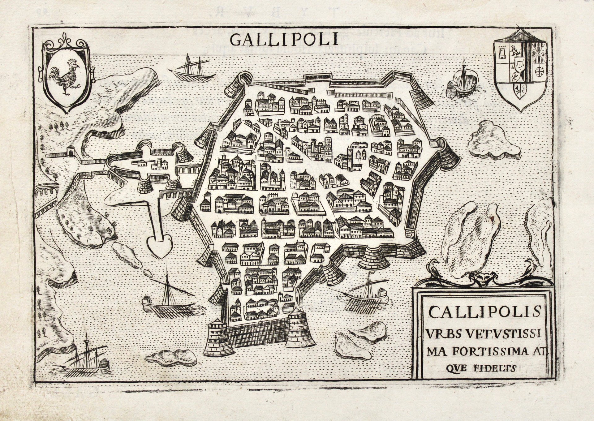 Incisione in rame, mm 120x180.<BR>Tratta da “Theatrum urbium Italicarum” prima edizione di questa raccolta di piante e<BR>vedute di città (senza dubbio da preferire per freschezza di stampa delle lastre alla<BR>successiva), ristampata successivame<BR>nte a Vicenza nel 1616 da Domenico Amadio con<BR>l’aggiunta di alcune tavole (67 tavole invece delle 59 originali). Testo latino al verso, di<BR>autore ignoto, anche se alcuni studiosi ipotizzano sia dello stesso Bertelli.<BR>Ottimo esemplare