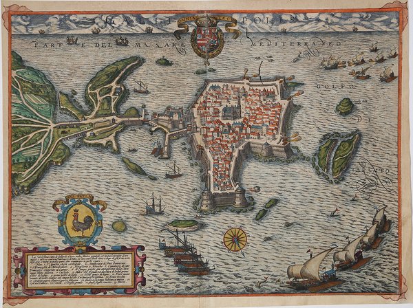 Pianta prospettica di Gallipoli, orientata a sud. La veduta è stata realizzata successivamente a un'incisione su rame di Natale Bonifacio. Il disegnatore era Giambattista Crispi. L’opera è inserita nel ' Civitates Orbis Terrarum, il primo atlante devoto esclusivamente alle piante e vedute delle principali città del mondo. Il primo volume delle ' Civitates Orbis Terrarum ' fu pubblicato a Colonia nel 1572. Il sesto e ultimo volume apparve nel 1617. Questo grande atlante di città – cartografia urbana - curato da Georg Braun e inciso in gran parte da Franz Hogenberg, conteneva 546 prospettive, vedute a volo d'uccello e vedute cartografiche di città di tutto il mondo. Franz Hogenberg realizzò le tavole dei primi quattro volumi e Simon van den Neuwel (Novellanus, attivo dal 1580) quelle dei volumi V e VI. Georg Braun (1541-1622), un ecclesiastico di Colonia, fu il principale redattore dell'opera e fu molto aiutato nel suo progetto dalla vicinanza e dal continuo interesse di Abraham Ortelius, il cui ' Theatrum Orbis Terrarum ' del 1570 fu, come raccolta sistematica e completa di mappe di stile uniforme, il primo vero atlante. Le ' Civitates, ' in effetti, erano destinate ad accompagnare il ' Theatrum, ' come indicato dalla somiglianza dei titoli e dai riferimenti contemporanei sulla natura complementare delle due opere. Tuttavia, le ' Civitates ' erano progettate per avere un approccio più popolare, senza dubbio perché la novità di una raccolta di piante e vedute di città rappresentava un'impresa commerciale più rischiosa di un atlante mondiale, per il quale c'erano stati diversi precedenti di successo. Franz Hogenberg (1535-1590) era figlio di un incisore di Monaco che si era stabilito a Malines. Incise la maggior parte delle tavole del ' Theatrum ' di Ortelius e la maggior parte di quelle delle ' Civitates, e potrebbe essere anche indicato come il responsabile dell'origine del progetto. Oltre un centinaio di artisti e cartografi diversi, il più importante dei quali fu l'artista di Anversa Georg Hoefnagel (1542-1600), fornirono i disegni per le tavole delle ' Civitates. Hoefnagel non solo contribuì alla maggior parte del materiale originale per le città spagnole e italiane, ma rielaborò e modificò anche quello di altri collaboratori. Dopo la morte di Hoefnagel, il figlio Jakob continuò il lavoro per le ' Civitates. Gli autori della raccolta si proponevano di raffigurare "non icones et typi urbium", cioè non immagini generiche e tipizzate, "sed urbes ipsae admirabili caelaturae artificio, spectantium oculis subiectae appareant": non intendeva alludere o idealizzare, ma rappresentare fedelmente sulla carta, riprodurre esattamente, e in tempo reale, ciò che l'occhio vede, come annunciato nella prefazione al primo volume delle ' Civitates Orbis Terrarum. Come detto, il modello di questa pianta è LA FEDELISSIMA CITTA DI GALLIPOLI, del 1591, una “pianta prospettica a proiezione obliqua, disegnata da Giambattista Crispo (o Crispi) ed incisa da Natale Bonifacio per l’editore fiammingo Nicolas van Aelst. L’opera è dedicata al principe Flaminio Caracciolo. Redatta e commentata dal Crispo, nativo della città, fornisce una rappresentazione allargata ad includere le caratteristiche del paesaggio marino e i particolari del frastaglio costiero. Nella legenda, l’autore è attento a registrare i siti archeologici, ma spesso equivoca – come nota Benevolo – tra le impronte della civiltà classica e quelle – più recenti – della civiltà bizantina. L’opera, di grande rarità, fu il modello della pianta inserita nel quinto volume (1598) del Civitates Orbis Terrarum di Braun & Hogenberg e di tutta la topografia della città per circa due secoli” (cfr. S. Bifolco/ F. Ronca, Cartografia e Topografia italiana del XVI secolo, tav. 1104). Incisione in rame, meravigliosa coloritura coeva, in ottimo stato di conservazione. Bird's-eye view of Gallipoli, oriented to the south. The view is made after a copper engraving by Natale Bonifacio. The draughtsman was Giambattista Crispi. The work is included in the ' Civitates Orbis Terrarum, the first atlas devoted exclusively to plans and views of the world's major cities. Printed in six volumes between 1572 and 1617 it was so successful and widespread that several editions translated into Latin, German and French were printed. The first volume of the ' Civitates Orbis Terrarum ' was published in Cologne in 1572. The sixth and the final volume appeared in 1617. This great city atlas, edited by Georg Braun and largely engraved by Franz Hogenberg, eventually contained 546 prospects, bird-eye views and map views of cities from all over the world. Fransz Hogenberg produced the plates for the first four books, and Simon van den Neuwel (Novellanus, active since 1580) those for volumes V and VI. Georg Braun (1541-1622), a cleric of Cologne, was the principal editor of the work, and was greatly assisted in his project by the close, and continued interest of Abraham Ortelius, whose ' Theatrum Orbis Terrarum ' of 1570 was, as a systematic and comprehensive collection of maps of uniform style, the first true atlas. The ' Civitates, ' indeed, was intended as a companion for the ' Theatrum, ' as indicated by the similarity in the titles and by contemporary references regarding the complementary nature of two works. Nevertheless, the ' Civitates ' was designs to be more popular in approach, no doubt because the novelty of a collection of city plans and views represented a more hazardous commercial undertaking than a world atlas, for which there had been a number of successful precedents. Franz Hogenberg (1535-1590) was the son of a Munich engraves who settled in Malines. He engraved most of the plates for Ortelius's ' Theatrum ' and the majority of those in the ' Civitates, and may have been responsible for originating the project. Over a hundred of different artists and cartographers, the most significant of whom was Antwerp artist Georg Hoefnagel