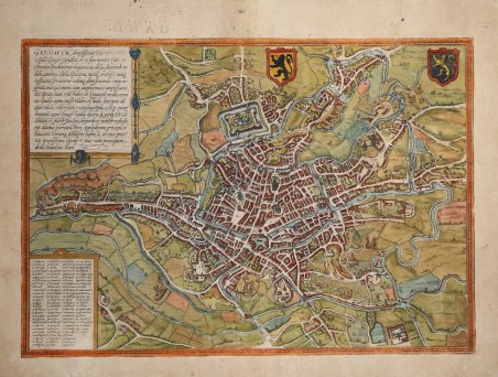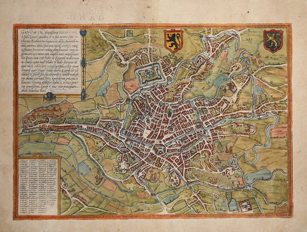 Bella veduta a volo d'uccello della città di Gand (Ghent) in Belgio. La veduta di Gand mostra la città da nord-ovest in pianta da una grande altezza. Il nucleo storico della città occupa la penisola tra i due fiumi Schelda e Leie. La cattedrale di Sint-Baafs (51) si trova quasi al centro della mappa: ospita la famosa Pala di Gand dipinta da Hubert e Jan van Eyck. ' L’opera è inserita nel ' Civitates Orbis Terrarum, il primo atlante devoto esclusivamente alle piante e vedute delle principali città del mondo. Il primo volume delle ' Civitates Orbis Terrarum ' fu pubblicato a Colonia nel 1572. Il sesto e ultimo volume apparve nel 1617. Questo grande atlante di città – cartografia urbana - curato da Georg Braun e inciso in gran parte da Franz Hogenberg, conteneva 546 prospettive, vedute a volo d'uccello e vedute cartografiche di città di tutto il mondo. Franz Hogenberg realizzò le tavole dei primi quattro volumi e Simon van den Neuwel (Novellanus, attivo dal 1580) quelle dei volumi V e VI. Georg Braun (1541-1622), un ecclesiastico di Colonia, fu il principale redattore dell'opera e fu molto aiutato nel suo progetto dalla vicinanza e dal continuo interesse di Abraham Ortelius, il cui ' Theatrum Orbis Terrarum ' del 1570 fu, come raccolta sistematica e completa di mappe di stile uniforme, il primo vero atlante. Le ' Civitates, ' in effetti, erano destinate ad accompagnare il ' Theatrum, ' come indicato dalla somiglianza dei titoli e dai riferimenti contemporanei sulla natura complementare delle due opere. Tuttavia, le ' Civitates ' erano progettate per avere un approccio più popolare, senza dubbio perché la novità di una raccolta di piante e vedute di città rappresentava un'impresa commerciale più rischiosa di un atlante mondiale, per il quale c'erano stati diversi precedenti di successo. Franz Hogenberg (1535-1590) era figlio di un incisore di Monaco che si era stabilito a Malines. Incise la maggior parte delle tavole del ' Theatrum ' di Ortelius e la maggior parte di quelle delle ' Civitates, e potrebbe essere anche indicato come il responsabile dell'origine del progetto. Oltre un centinaio di artisti e cartografi diversi, il più importante dei quali fu l'artista di Anversa Georg Hoefnagel (1542-1600), fornirono i disegni per le tavole delle ' Civitates. Hoefnagel non solo contribuì alla maggior parte del materiale originale per le città spagnole e italiane, ma rielaborò e modificò anche quello di altri collaboratori. Dopo la morte di Hoefnagel, il figlio Jakob continuò il lavoro per le ' Civitates. Gli autori della raccolta si proponevano di raffigurare "non icones et typi urbium", cioè non immagini generiche e tipizzate, "sed urbes ipsae admirabili caelaturae artificio, spectantium oculis subiectae appareant": non intendeva alludere o idealizzare, ma rappresentare fedelmente sulla carta, riprodurre esattamente, e in tempo reale, ciò che l'occhio vede, come annunciato nella prefazione al primo volume delle ' Civitates Orbis Terrarum. Incisione in rame, finemente colorata a mano, in ottimo stato di conservazione. Fine early bird's-eye-view of the City of Gand (Ghent) in Belgium. ' The view of Ghent shows the city from the northwest in plan view from a great height. The historical core of the city occupies the peninsula between the two Rivers Schelde and Leie. The cathedral of Sint-Baafs (51) is almost at the very centre of the map: it houses the famous Ghent Altarpiece painted by Hubert and Jan van Eyck. ' The work is included in the ' Civitates Orbis Terrarum, the first atlas devoted exclusively to plans and views of the world's major cities. Printed in six volumes between 1572 and 1617 it was so successful and widespread that several editions translated into Latin, German and French were printed. The first volume of the ' Civitates Orbis Terrarum ' was published in Cologne in 1572. The sixth and the final volume appeared in 1617. This great city atlas, edited by Georg Braun and largely engraved by Franz Hogenberg, eventually contained 546 prospects, bird-eye views and map views of cities from all over the world. Fransz Hogenberg produced the plates for the first four books, and Simon van den Neuwel (Novellanus, active since 1580) those for volumes V and VI. Georg Braun (1541-1622), a cleric of Cologne, was the principal editor of the work, and was greatly assisted in his project by the close, and continued interest of Abraham Ortelius, whose ' Theatrum Orbis Terrarum ' of 1570 was, as a systematic and comprehensive collection of maps of uniform style, the first true atlas. The ' Civitates, ' indeed, was intended as a companion for the ' Theatrum, ' as indicated by the similarity in the titles and by contemporary references regarding the complementary nature of two works. Nevertheless, the ' Civitates ' was designs to be more popular in approach, no doubt because the novelty of a collection of city plans and views represented a more hazardous commercial undertaking than a world atlas, for which there had been a number of successful precedents. Franz Hogenberg (1535-1590) was the son of a Munich engraves who settled in Malines. He engraved most of the plates for Ortelius's ' Theatrum ' and the majority of those in the ' Civitates, and may have been responsible for originating the project. Over a hundred of different artists and cartographers, the most significant of whom was Antwerp artist Georg Hoefnagel (1542-1600), engraved the cooper-plates of the ' Civitates ' from drawings. He not only contributed most of the original material for the Spanish and Italian towns but also reworked and modified those of other contributors. After Hoefnagel's death his son Jakob continued the work for the Civitates. The author set out to depict "non icones et typi urbium," that is, not generic and typified images, "sed urbes ipsae admirabili caelaturae artificio, spectantium oculis subiectae appareant": not intended to allude or idealize but to represent faithfully on paper, to repro