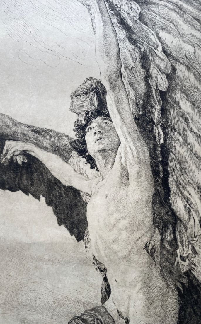 La fama di Greiner è affidata soprattutto all’opera grafica che consiste in 112 opere, in prevalenza litografie. Il suo stile, anche quando opera sulla pietra litografica, è eminentemente legato al segno, cosicché spesso le sue litografie vengono scambiate per incisioni all’acquaforte e al bulino. Il Ganymede è un tipico esempio delle scelte estetiche e della ricerca formale dell'autore. Simbolismo mistico con forti valenze scenografiche. Il chiaroscuro incornicia la figura asciutta del giovane, mentre Giove è appena visibile nella parte alta della composizione. Il formato verticale contribuisce a dare enfasi alla scena. Il punto di vista è terreno, così come i corpi non anno nulla di sovrumano, ma la composizione suggerisce la dimensione onirica del mito. L'esemplare reca nel margine inferiore scritto autografo della vedova di Otto Greiner: dallo studio di Otto Greiner. Hannina Greiner. Esemplare nel IV/V stato su carta avorio spessa. Ottima impressione, ampi margini. Una piega nella carta nel margine inferiore.