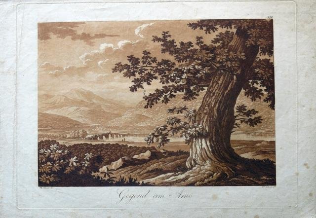 1780 circa. Acquatinta virata al seppia, cm 28,2 x 38,2 (alla lastra) in alto tavola VIII, in basso a sinistra “Ph. Hackert del.”, in basso a destra P.W. Schwarz fct.”. Veduta campestre dell'Arno con grosso albero in primo piano. Margini un poco ingialliti, rifilato (oltre la battuta della lastra) il superiore.