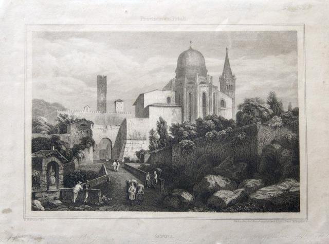 Trieste, 1860 circa. Incisione su acciaio, b/n, cm 14,2 x 20,2 (la parte figurata) più margini. Scorcio del castello di Gemona, con le mura e personaggi in costume. Patina di sporco ai margini, un poco rifilata ma buono l'inciso.