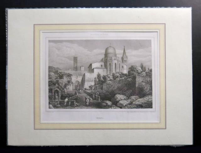 Trieste, 1860 circa. Incisione su acciaio, b/n, cm 14,2 x 20,2 (la parte figurata) più margini. Scorcio del castello di Gemona, con le mura e personaggi in costume. Molto buono lo stato di conservazione.
