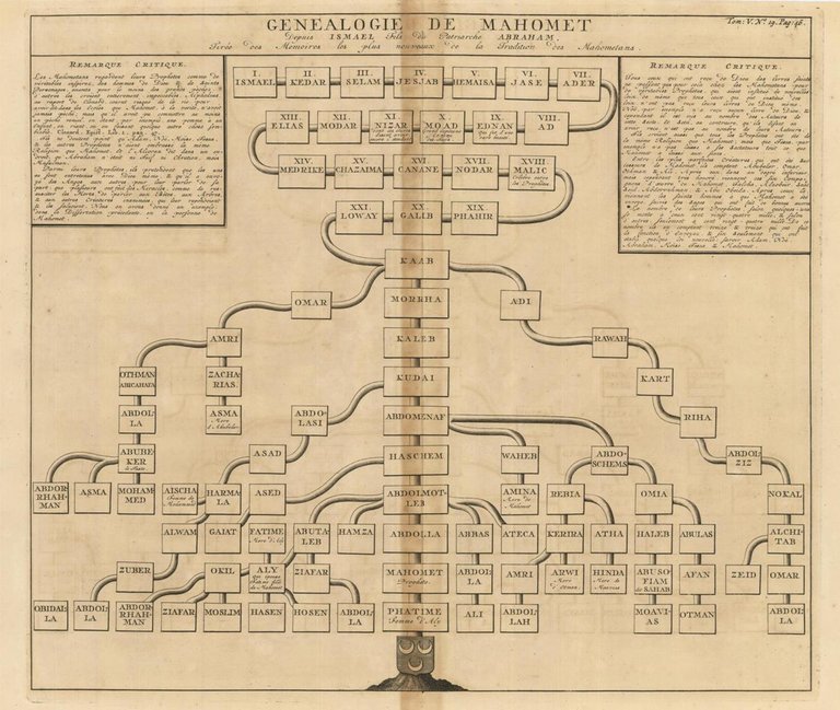 Stampa, antica ed originale, con tavola genealogica di Maometto, a partire da Ismaele, figlio del patriarca Abramo. Include testo descrittivo. Iinserita nel V Tomo ”Atlas Historique ou nouvelle introduction a l’Histoire, à la Chronologie & à la Geographie Ancienne & Moderne…”, pubblicato ad Amsterdam nel 1719. Atlante che, con la sua pubblicazione, coniuga le mappe geografiche con incisioni e informazioni di carattere geografico, araldico, etnografico e storico così rendendo l’opera in sette volumi molto innovativa.Henri Abraham Chatelain (1684 - 1743), pastore ugonotto originario di Parigi visse alternativamente a Parigi, Londra, L'Aia ed Amsterdam. Conosciuto come cartografo olandese per il sua opera cartografica monumentale in sette volumi “Atlas Historique” pubblicata ad Amsterdam con i suoi fratelli.