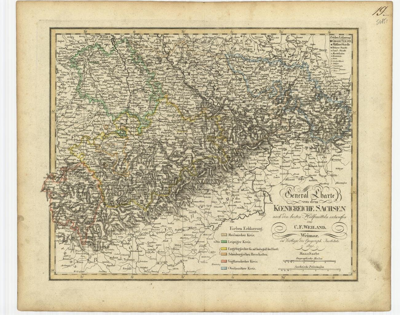 Carta geografica, antica ed originale, con coloritura coeva ai confini. La mappa edita nella città tedesca di Weimar è stata disegnata nel 1820 e rappresenta il territorio della Sassonia. Autore: Geograph: Instituts edit. Luogo: Germania. Anno: 1821. Tecnica: incisione in rame. Dimensioni: 315x395.