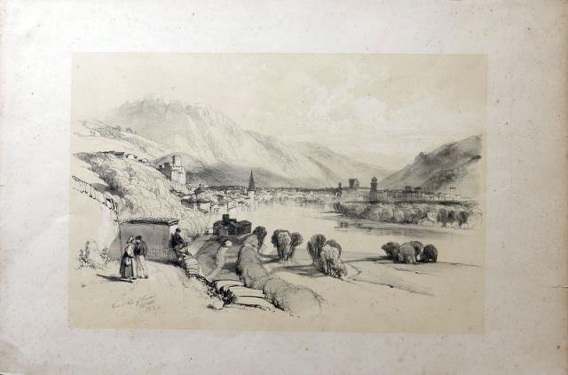In basso a sn. firmata e datata “Sept. 1834”. Tono litografia con delicate porzioni di bianco a dare luce e colore, cm 36,8 x 55 (il foglio). Veduta della città animata da figure in primo piano.
